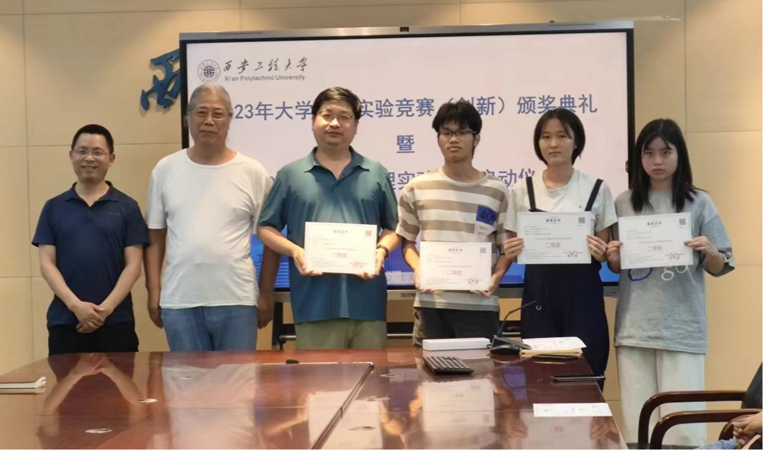 会上,成鹏飞对2023年获得全国大学生物理实验竞赛的获奖师生颁发了表彰证书。讲话中,他强调:全国大学生物理实验竞赛是教育部高教司批准的大学生国家级物理学科类实验竞赛,旨在培养大学生的物理兴趣、创新意识与实践能力。学院依托陕西省物理实验教学中心,由刘汉臣教授领衔的指导小组,通过赛前培训、集中指导、经验交流,结合三全育人导师团和本科生导师制,全面激发学生的物理学习兴趣和潜能,提升团队协作和综合素质,深化物理实验教学改革,提高教学质量与创新人才培养。经过系统培训和指导,2023年荣获了2个全国一等奖、3个二等奖及优秀组织奖,希望参赛学生接续努力,争取取得更好成绩。