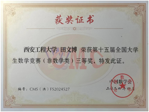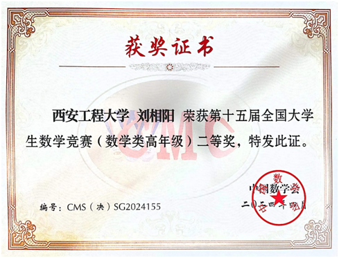 2024年4月20日-21日,由中国数学会主办的“第十五届全国大学生数学竞赛(决赛)”在山东大学中心校区成功举办。我校AC米兰中文2020级信息与计算科学专业本科生刘相阳获数学类二等奖;2020级微电子科学与工程专业本科生田文博获非数学类三等奖。