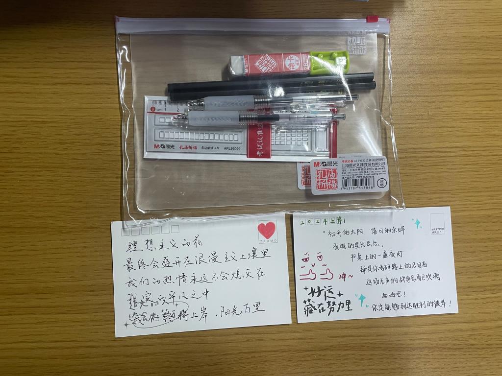 期间,学院老师们为考研同学们送上低年级学弟学妹们手写考研祝福卡以及学院准备的考研文具套装。同学们纷纷表示,学院的关怀很暖心,自己定会奋战到底,以坚定的信心和积极向上的精神风貌应对考研,为自己交上满意的答卷。