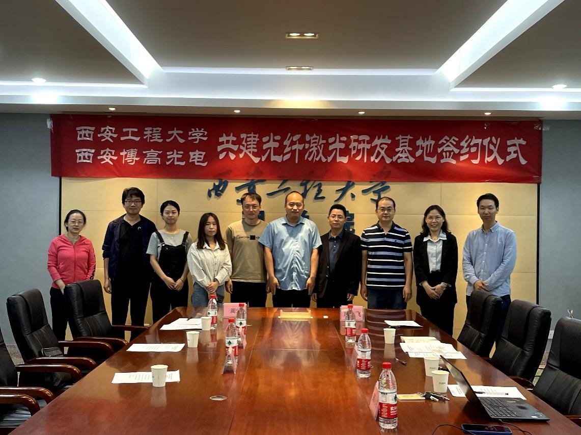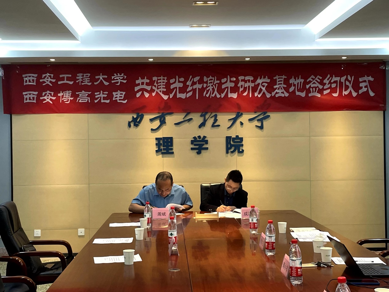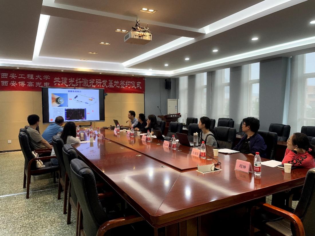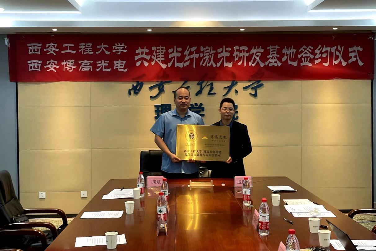 接着,西安博高光电科技有限公司董事长周斌对公司的基本情况做了介绍,对研究生联合培养模式、实验室与实习基地管理方式、科技联合攻关运作方式提出了意见和建议。张国青教授介绍了AC米兰中文物理学科的发展状况,韩小祥副教授展示了光学团队近几年的最新科研成果,双方围绕光纤激光器开展了基础理论探索、关键技术攻关和前沿应用研究深入研讨。随后,AC米兰中文副院长成鹏飞教授及西安博高光电科技有限公司董事长周斌就共建“光纤激光器件与应用实验室” 进行了签约及挂牌仪式。最后,张国青教授带领周斌董事长一行人参观了物理学科的科研实验室。