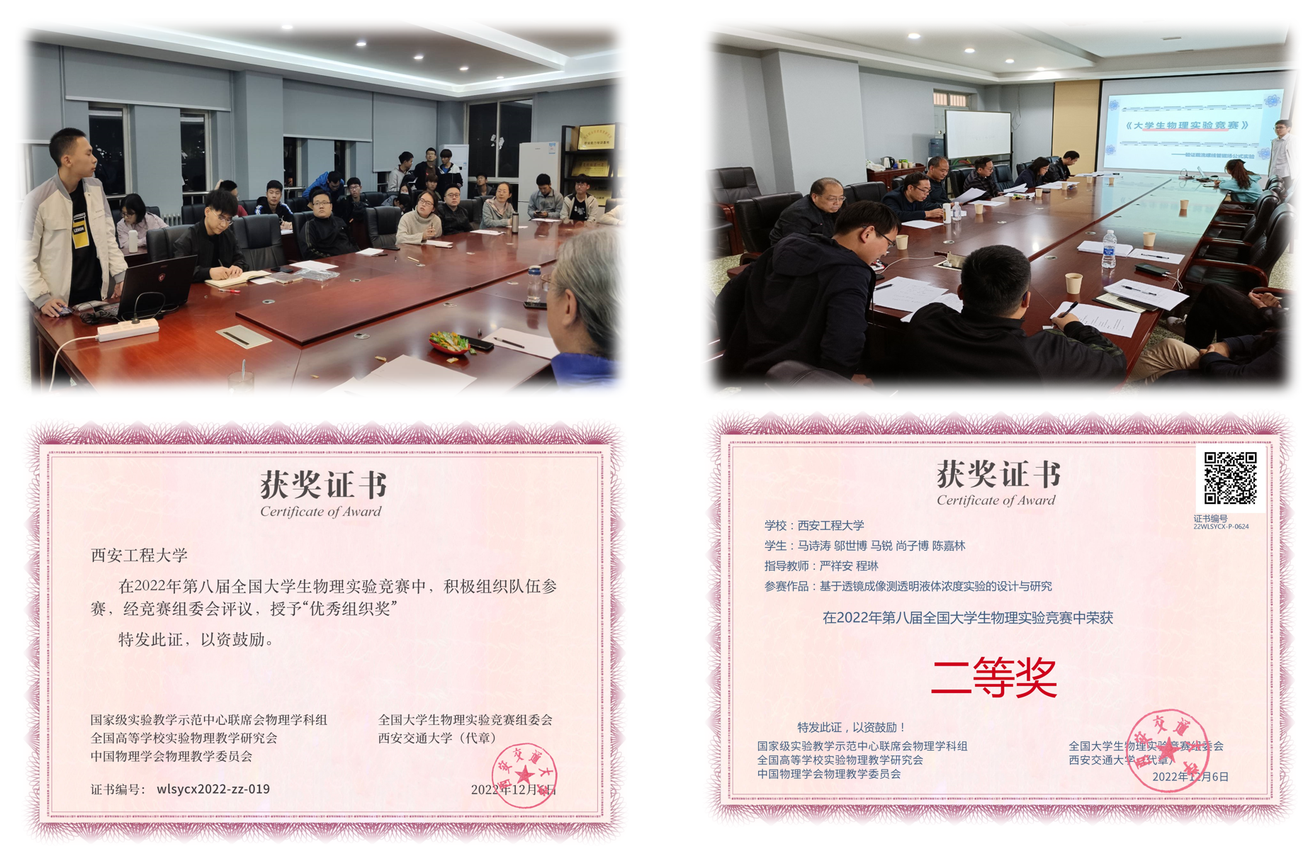 今年是我校第三次参加该物理实验竞赛。自4月以来,在学校教务处、校团委、工程训练中心、电子信息学院等相关部门的支持和协助下,AC米兰中文物理实验教学中心具体组织安排了相关事宜。为更好指导学生竞赛,达到以赛促学、以赛促教的目的,学院依托陕西省物理实验教学中心组建了一支优秀的教师指导小组。通过“赛前培训、集中指导、经验交流、注重改革”打造了一套完整的组织形式,通过专人负责、团队协作,集体指导与个人指导相结合,结合三全育人导师团和本科生导师制,进一步激发了我校大学生对大学物理和物理实验课程的学习兴趣和潜能,培养了我校学生的创新精神和实践能力,提升了我校学生的团队协作意识和综合素质,深化了我校的物理实验教学改革,提高了本校物理实验教学质量和高素质创新性人才培养质量。通过赛事宣传,校内初赛、复赛、决赛的选拔,最终评选出5支队伍代表我校参加此次国家比赛。经过激烈角逐,5支队伍全部获得国家奖项。