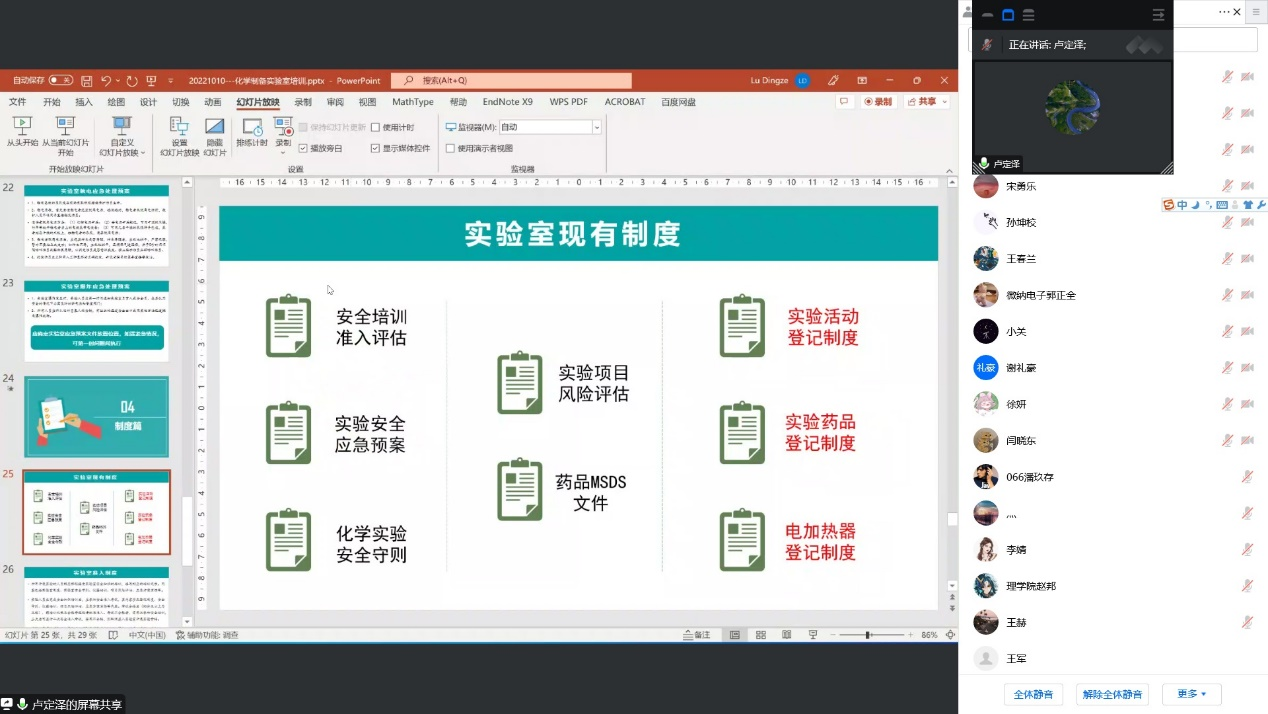 会议上,卢定泽教授就安全培训准入评估、实验安全应急预案、化学实验安全守则、实验活动登记制度和电加热器登记制度等进行了详细介绍。并针对疫情封校期间,详解了实验室垃圾的打包封存、实验废液的分类归置及“日日值,互监督”的实验室值日制度。