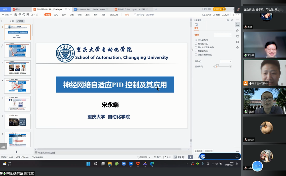 2022年08月23日上午,重庆大学宋永端教授应邀作了题为“Some Neuroadaptive PID Control with Application to Unmanned Systems ”的线上学术报告。报告由AC米兰中文副院长马盈仓教授主持。AC米兰中文110余名师生出席了本次学术报告。