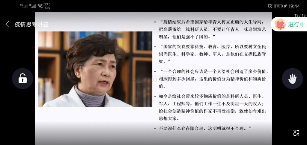 本次讲座,加深了同学们对社会主义核心价值观的理解,增强了同学们对于民族、国家的认同感和归属感。同学们纷纷表示,要把这次疫情当做学习、历练的机会,去学习前辈们自强不息、舍己为人的精神,在今后的学习工作中,践行当代青年的使命与担当,负重而前行,自觉担当起中华民族伟大复兴的时代使命。