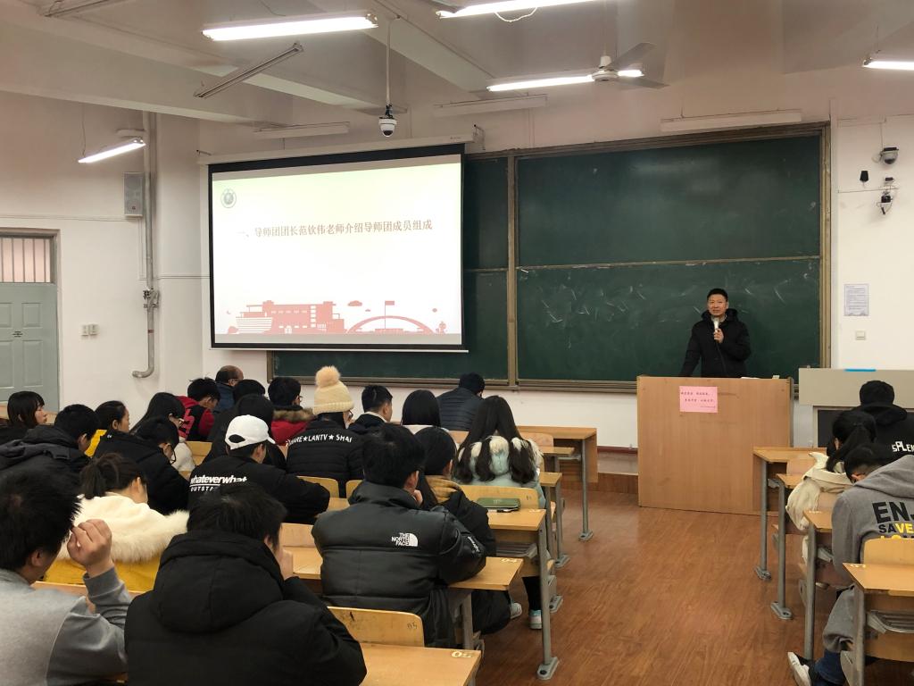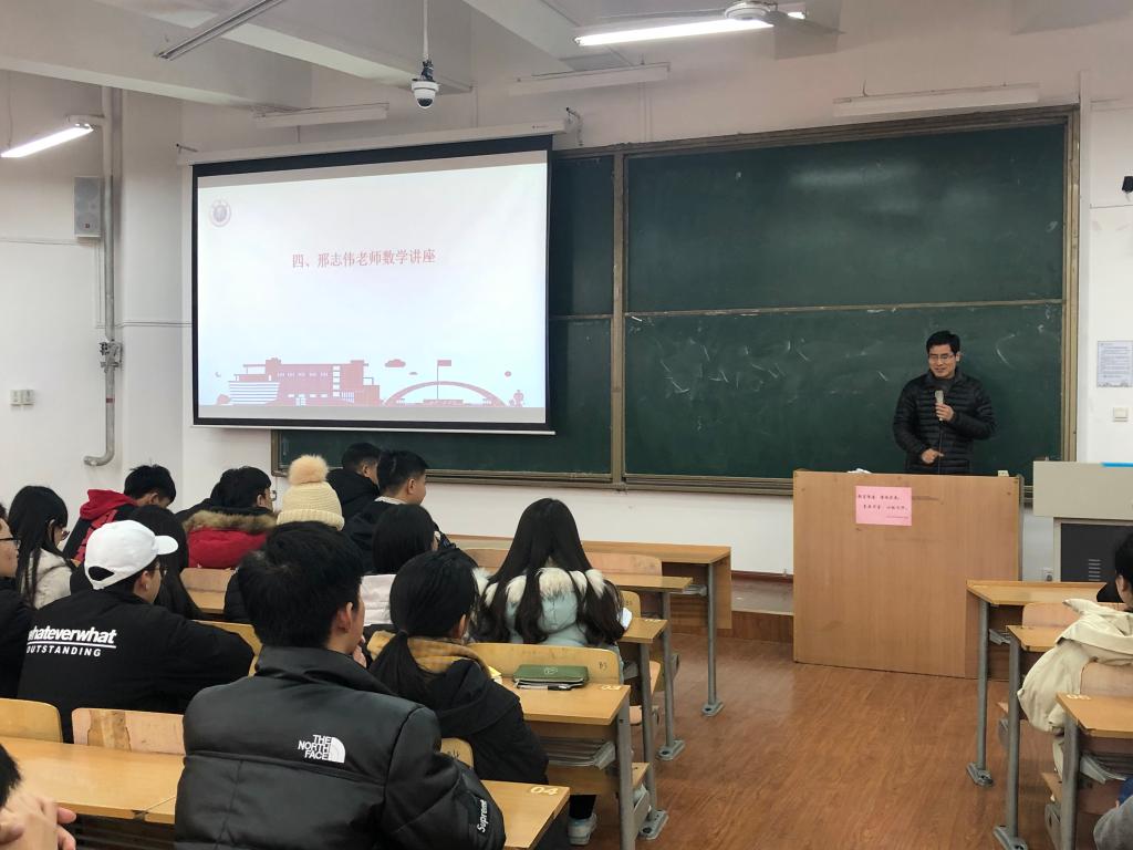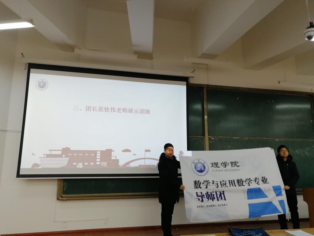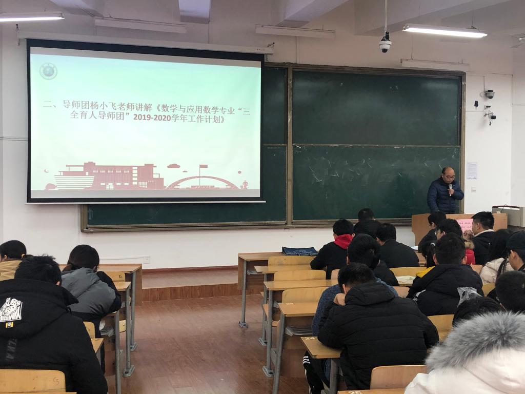 田宇飞介绍了AC米兰中文“三全育人导师团”工作开展情况;导师团团长范钦伟向同学们介绍了导师团成员组成;导师团成员杨小飞介绍了《数学与应用数学专业“三全育人导师团”2019-2020学年工作计划》,他讲到:导师团将着重加强思想政治教育、专业认知水平、创新创业引导、心理健康教育等,帮助学生明确学习目的和成才目标,促进学生专业知识、能力、素质协调发展。随后,导师团团长范钦伟和导师团秘书田宇飞向全体成员展示了数学与应用数学专业导师团团旗。最后邢志伟老师为学生做了数学讲座,他通过介绍数学在日常生活中的理论应用,以及在5G等多方面的应用实例,向同学们讲述了数学在日常生活中的实际应用和重要性。