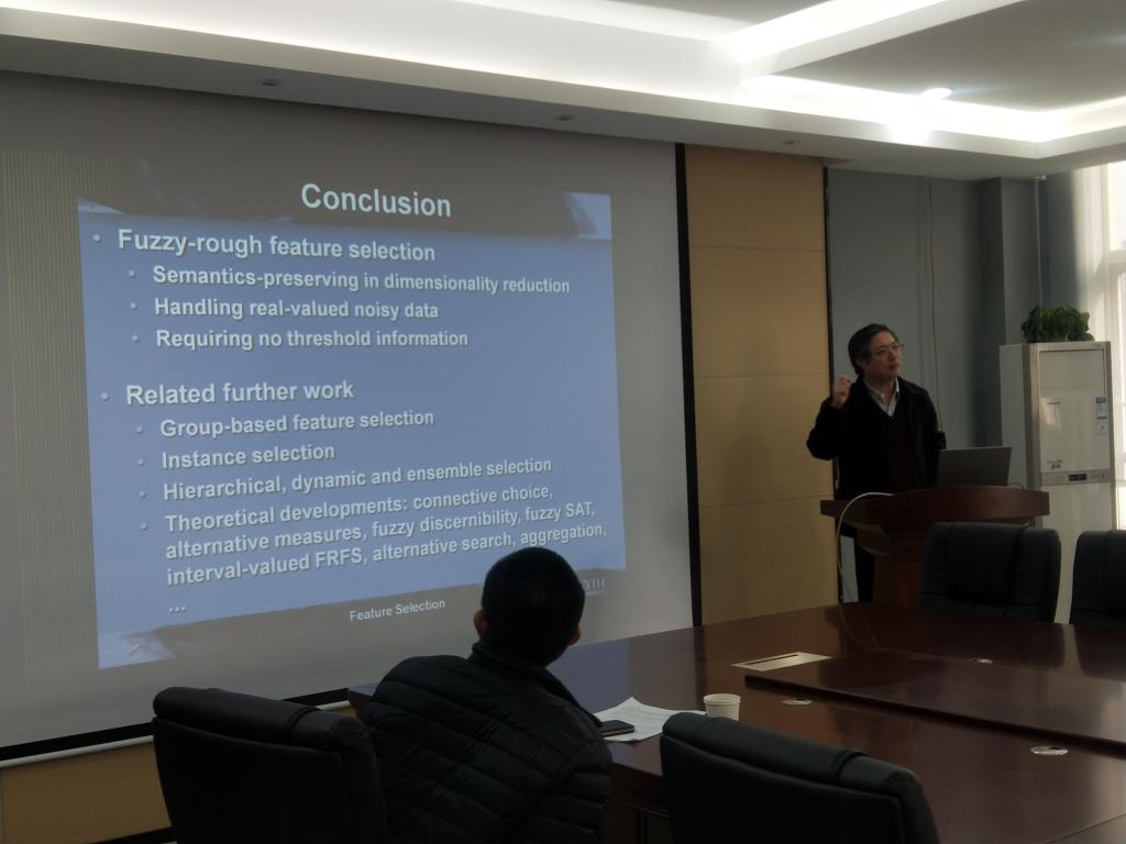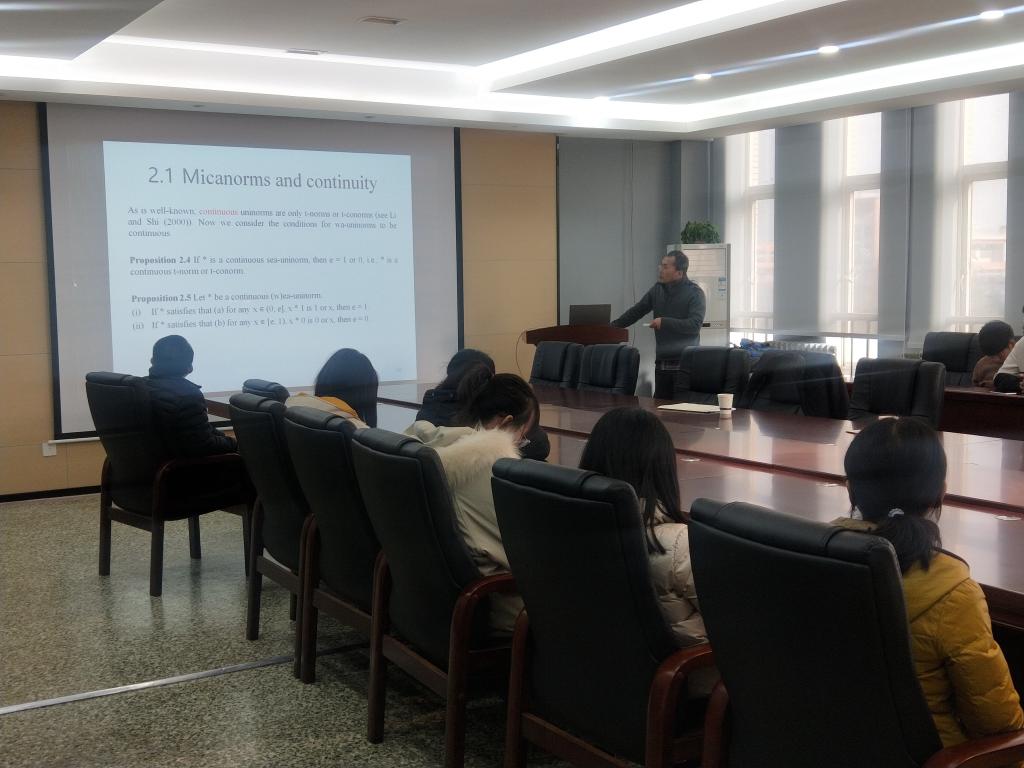 2019年12月20日上午, 首先,Qiang Shen教授做了“Feature selection in systems modeling with imprecise data”的报告, 集中讨论基于粗糙和模糊粗糙理论的近似FS机构的发展和应用。特别是,模糊粗糙特征选择(FRFS)适用于离散和实值噪声数据(或两者的混合)。FRFS被证明是一种有效的语义保持数据降维技术。在介绍FS的一般背景时,报告首先介绍基于粗糙集的方法,然后重点介绍了FRFS及其在实际问题中的应用。会谈最后又概述进一步发展的机会。Qiang Shen教授更是为了照顾听报告人的接受能力,在中途多次详细解释一些基础理论概念。随后Eunsuk Yang副教授做了《Micanorm aggregation operators》的报告,主要内容是mica范数的基本代数性质。首先回顾mica范数的一般定义,具有结合律三种弱形式的mica范数,以及Lukasiewicz、Goedel和乘积弱e-结合(wea-)单范数。然后介绍了Lukasiewicz,Goedel和乘积t-范数的mica范数类似物,以及这些类似物的一些特征代数性质。