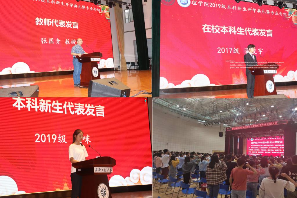 典礼在庄严的国歌声中拉开帷幕,成鹏飞首先介绍了学院的学科发展、专业设置、师资力量、培养体系等基本情况。教师代表、物理学科主任、国家自然科学基金获得者张国青,在校本科生代表、院学生会主席、2017级学生蒲俊宇,新生代表、2019级学生赵咪依次在典礼上做了发言。