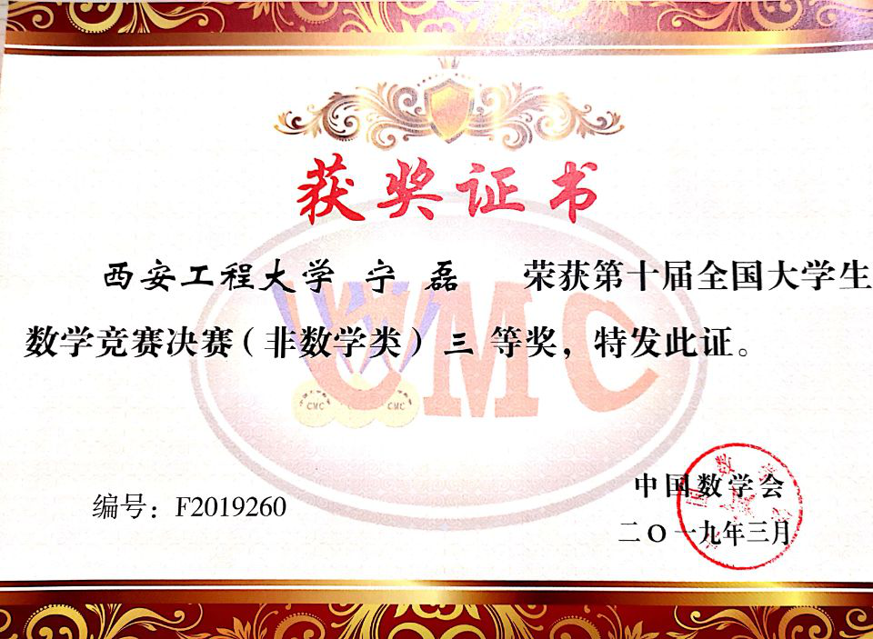 2019年3月29-31日,由中国数学会主办的“第十届全国大学生数学竞赛决赛”在哈尔滨工业大学圆满结束。我校2015级纺织工程专业学生宁磊荣获第十届全国大学生数学竞赛决赛三等奖(非数学类),这是我校连续第二年在该项比赛中获国家级奖项。