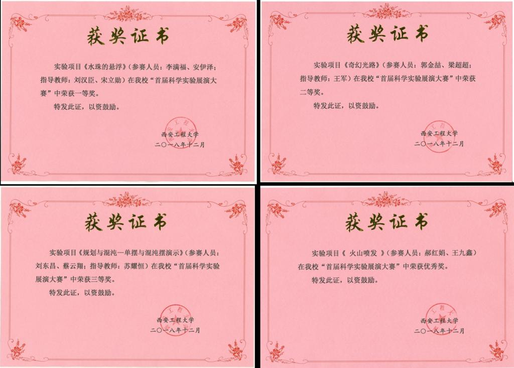 在校选拔赛中,我院由刘汉臣教授和宋立勋老师指导的《水珠的悬浮》荣获一等奖,苏耀恒老师指导的《规划与混沌—单摆与混沌摆演示》荣获二等奖,王军老师指导的《奇幻的光路》荣获三等奖,郝红娟老师参与并指导的《火山喷发》荣获优秀奖。