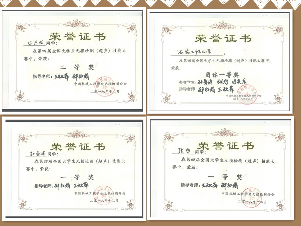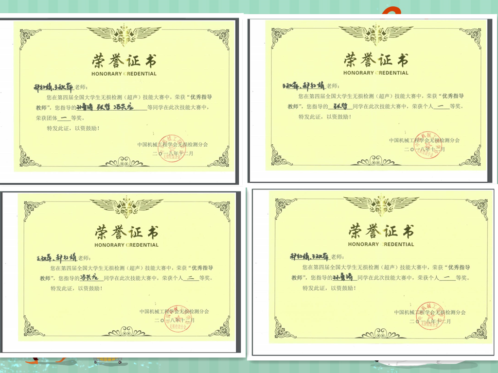 赛中,孙勇涛和张哲两位同学凭借扎实的专业知识和稳定的发挥均获得个人赛一等奖,冯兴龙获得个人赛二等奖,同时他们获得中国机械工程学会无损检测分会超声检测二级人员证书。王秋萍、郝红娟两位老师获得优秀指导教师荣誉,且我校荣获团体赛一等奖。