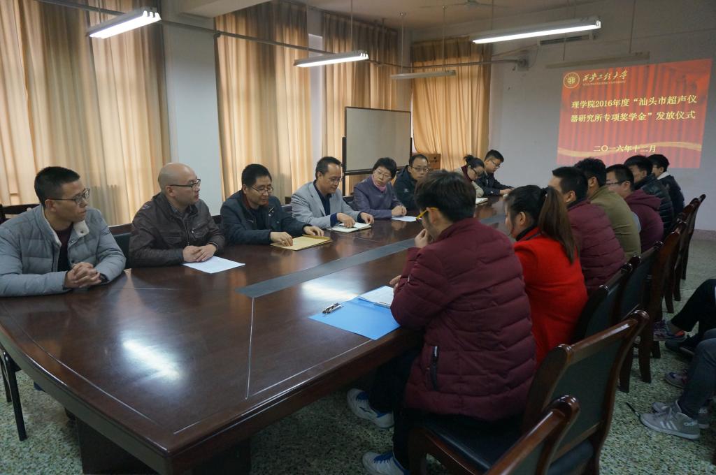 2016年12月7日,AC米兰中文举行了2016年度“汕头市超声仪器研究所有限公司专项奖学金”颁授仪式。院党委副书记杨森,物理学科负责人翟学军,教师代表、全体辅导员及获奖学生、学生代表近30人参加了仪式。仪式由AC米兰中文学工办主任戴新主持。