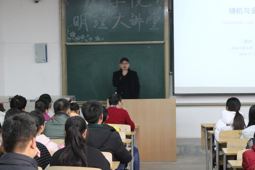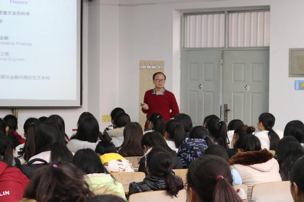 会上,薛红教授追溯了金融学的起源,从基础学科数学和金融学的关系入手,讲解了金融学的发展和现状,并就数学在金融学的运用进行了深入分析,用贴近生活的实例说明了金融工程和统计学在生活学习中的运用和广阔的发展前景,还就两个专业以后的研究方向做了说明。他生动形象的描述了随机与金融的奇妙联系,将同学们带入了色彩斑斓的数学世界,赢得阵阵掌声。