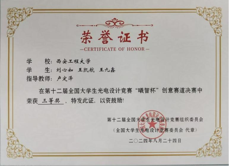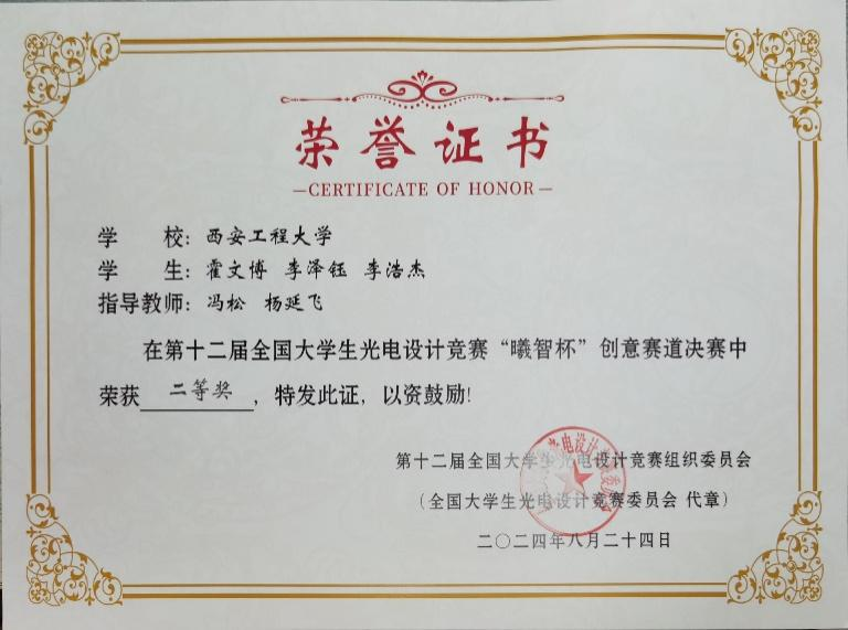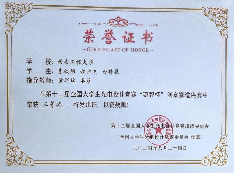 2024年8月23日至24日,由中国光学学会主办的第十二届全国大学生光电设计竞赛“曦智杯”创意赛道全国总决赛在西安电子科技大学南校区举行。本届大赛共吸引来自全国392所高校的4044支队伍、15309名师生报名参赛。参赛高校数及参赛队伍规模,创历史新高。经省赛组委会推荐,现场决赛评选等环节,我校荣获二等奖作品1项、三等奖作品2项。创下了我校在全国大学生光电设计竞赛国赛历史最佳成绩,实现突破!