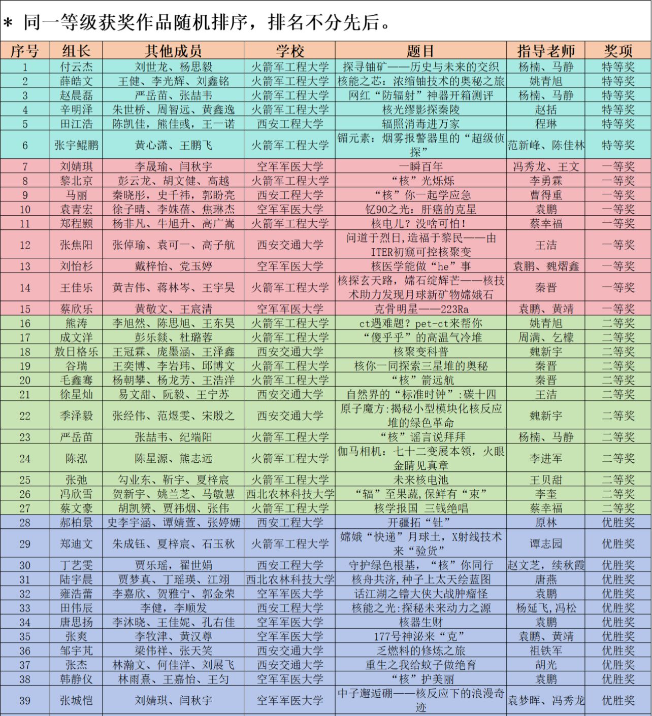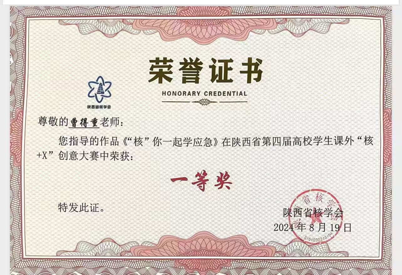 近日,陕西省第四届高校学生课外“核+X”创意大赛在西安落下帷幕,此次大赛由中国辐射防护学会和陕西省科学技术协会指导,陕西省核学会主办。来自省内各大高校的600余名本科生及研究生参与其中,经过层层评审,有116件作品进入终评。最终大赛评审委员会评选出特等奖6项、一等奖9项。我校学子凭借优异的发挥,荣获特等奖1项、一等奖1项,学校荣获优秀组织奖。