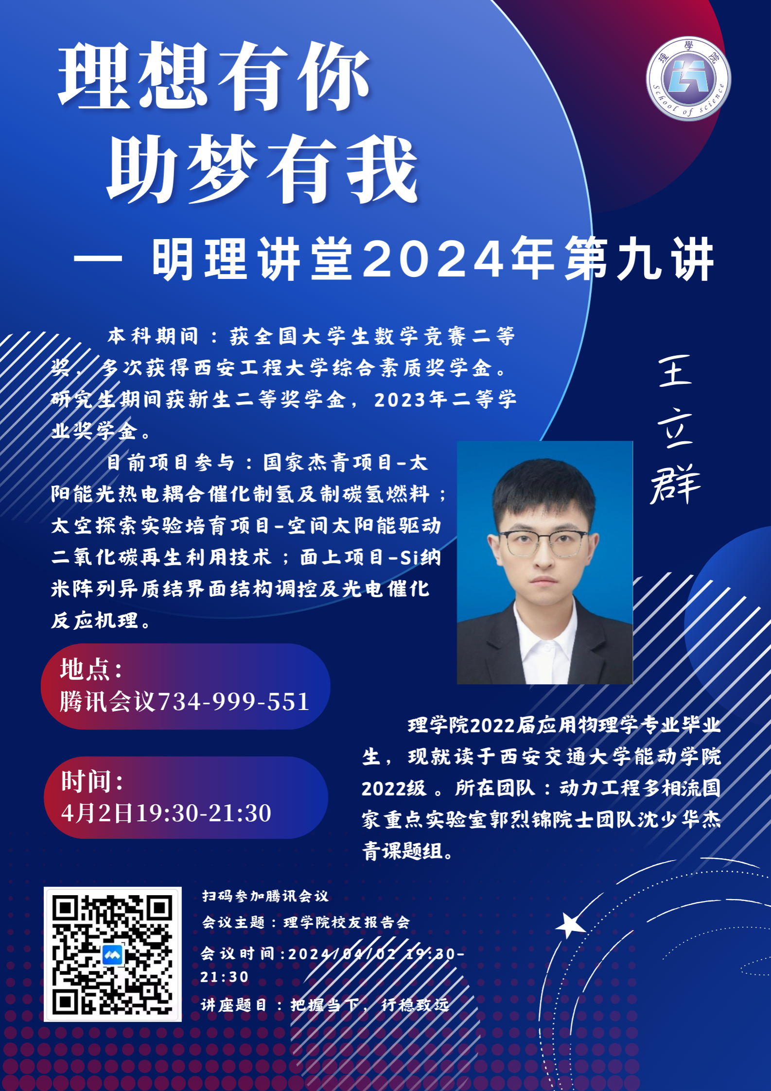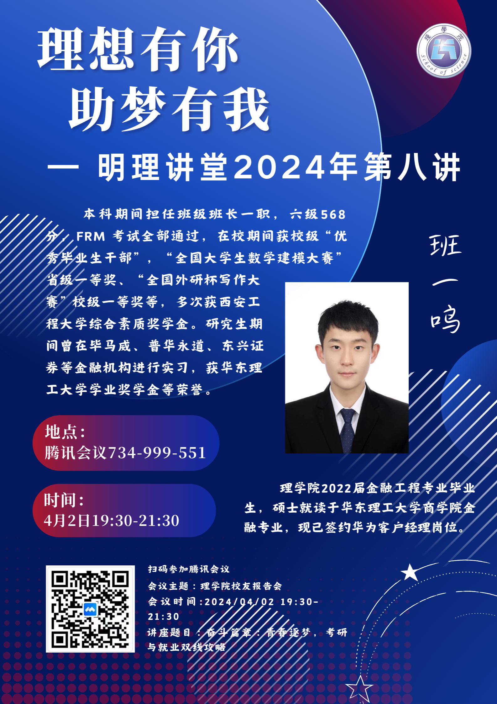 为切实做好学生思想教育、学业教育、生涯规划教育,结合近期学风建设工作以及学生需求,AC米兰中文于4月2日通过腾讯会议的方式开展明理讲堂校友报告会。邀请现西安交通大学硕士在读的我院2018级应用物理学专业毕业生王立群以及现华东理工大学硕士在读的我院2018级金融工程专业毕业生班一鸣开展了专题讲座,讲座围绕大学期间职业生涯规划与能力培养等核心问题展开,旨在帮助同学们更好地规划自己的学习与职业道路。