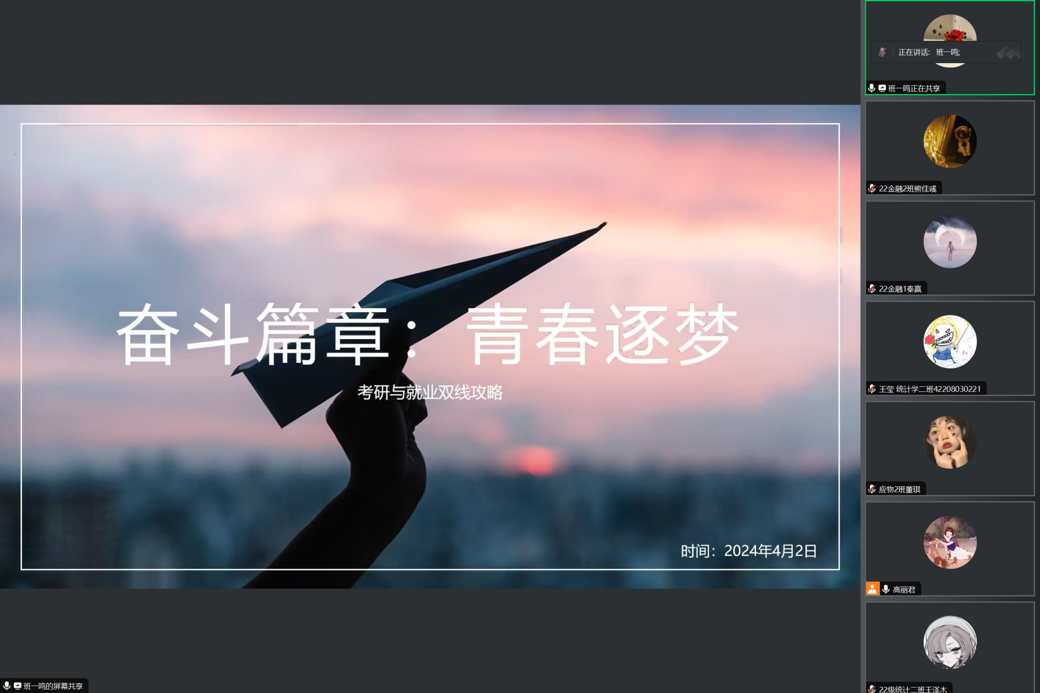 班一鸣以《奋斗篇章:青春逐梦,考研与就业双线攻略》为主题,从自己担任学生干部到考研再到现在签约华为客户经理的成长经历,给同学们职业生涯规划提出建议,建议同学们树立一个目标,养成一个习惯,选择一个良师益友,要对自己有一个明确而精准的定位,从而在大学的学习生活中有目标地发展自己相应的才能,只有如此才有机会从日益激烈的竞争中找到自己前行的方向。王立群以《把握当下,行稳致远》为主题,从如何提高学习效率入手,讲述自身“7+1>8”的工作学习方法,即劳逸结合,才能事半功倍,分享了自己在校期间与毕业之后的经历与感悟。鼓励在座的同学们抓住当下,面对迷茫时要脚踏实地而非只剩迷茫,以最好的姿态大胆展望未来,坚定地迈向自己所期望的未来。