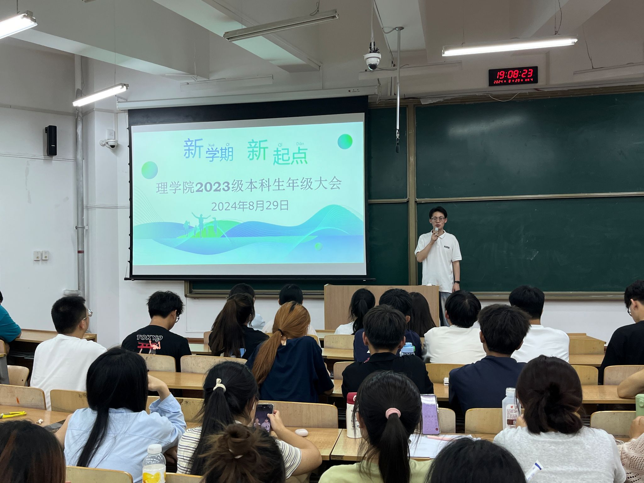 会上,宋琦从““暑假生活”“大一学年盘点”“大二秋季学期目标”和“注意事项”四个方面展开,为同学们新学期的学习目标和生活规划做出指导。首先,他就同学们暑假期间的学习生活情况进行沟通交流,提醒同学们及时调整作息,制定学期计划,以焕然一新的面貌、积极昂扬的斗志和踔厉奋发的姿态迎接新学期的到来。接着带领同学们回顾了大一学年,刚入学的军训、精心筹划的迎新晚会以及顽强拼搏的运动会等,这些都构成了专属于2023级学生的美好回忆。同时对上一学期的学习成绩进行分析,希望同学们及时反思、吸取教训、总结经验,面对即将到来的补缓考,鼓励大家认真复习,以诚信的态度对待每一次考试。此外,宋琦对同学们提出希望,希望大家在新学期合理规划时间,制定新学期计划,树立明确的学习目标,勇敢地迈出每一步。学业上不仅要追求优异成绩,更要积极参与各类学术科研竞赛;在课外之余也要多参与社会实践和志愿服务活动,拓展自己的视野,锻炼综合素质。最后,他还对同学们进行了新学期安全教育,强调了消防安全,防范电信网络诈骗,寝室卫生安全问题,要求全体学生务必遵守校规校纪,严禁夜不归寝和存放违禁电器,注重营造良好的学习生活环境,以健康的体魄迎接新学期多彩的校园生活。