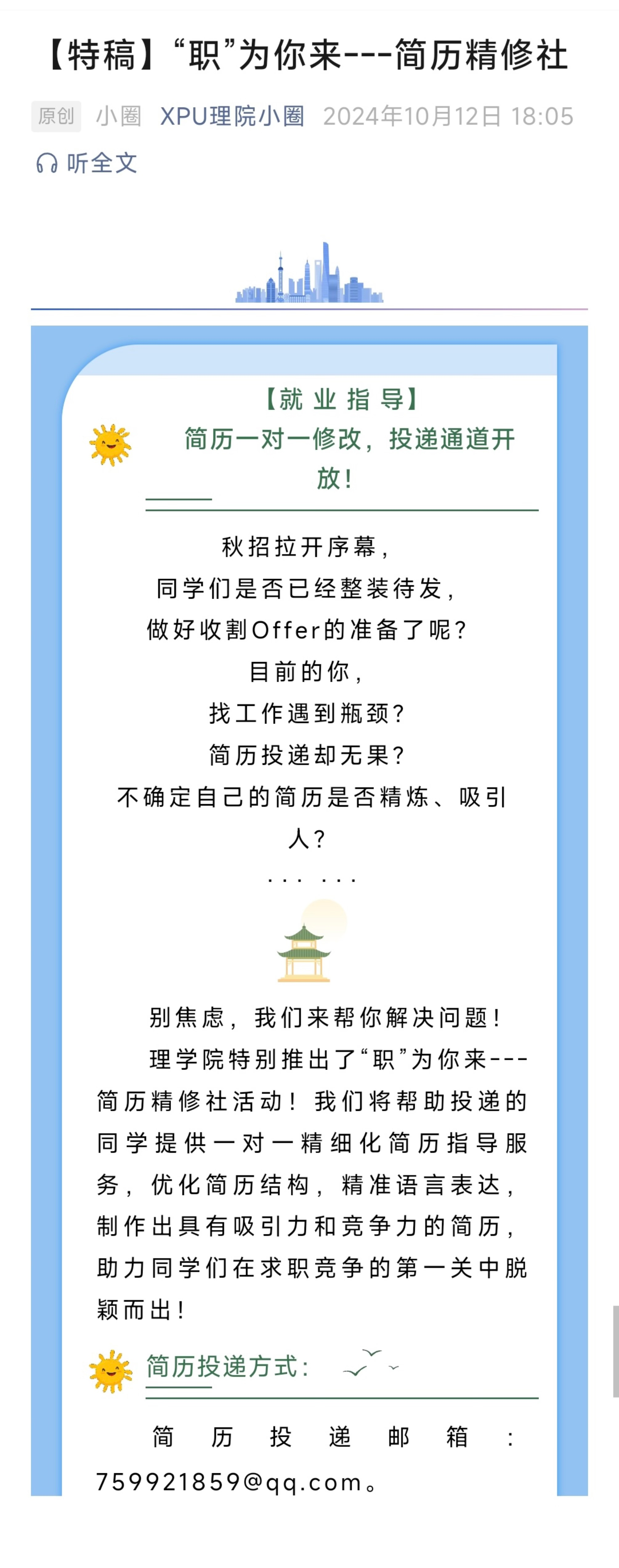 为提高学院2025届毕业生求职技能,帮助毕业生修改完善个人简历,促进高质量充分就业。结合秋季学生求职,AC米兰中文于近日举办了2025届毕业生“职为你来-简历精修社”活动。