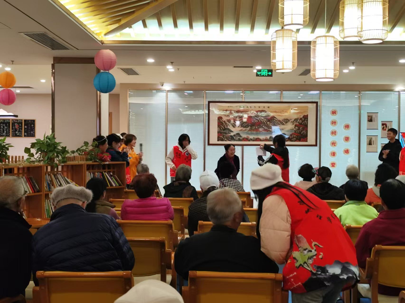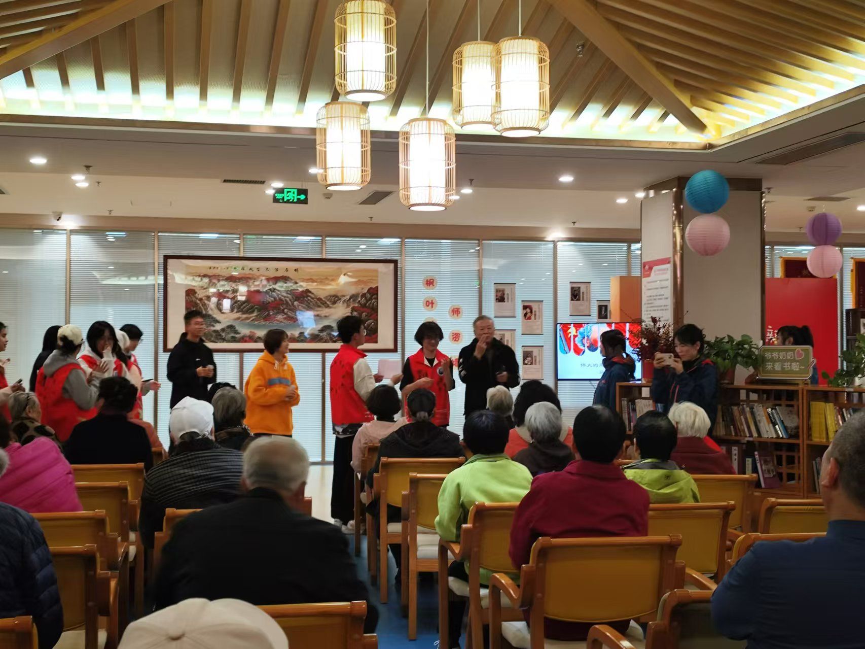 活动当天,志愿者们一抵达敬老院便迅速投入工作。通过游戏和节目穿插进行的形式,同学们分为表演和服务两队,为老人们带来了一场精彩纷呈的节目表演。同学们用悠扬的歌声填满了敬老院的每一个角落,老人们面带微笑,轻轻跟着哼唱,沉浸在这美妙的音乐氛围之中,脸上洋溢着幸福与陶醉。舞蹈表演环节更是活力四射,动感的节奏与志愿者们灵动的舞姿相互辉映,老人们的目光紧紧跟随着舞台,脸上绽放出灿烂的笑容。整个现场气氛热烈非凡,却又不失温馨与祥和。负责服务的同学们专注于照顾老人,陪老人聊天,组织他们参与互动游戏,让老人们在游戏中感受快乐,忘却孤独。