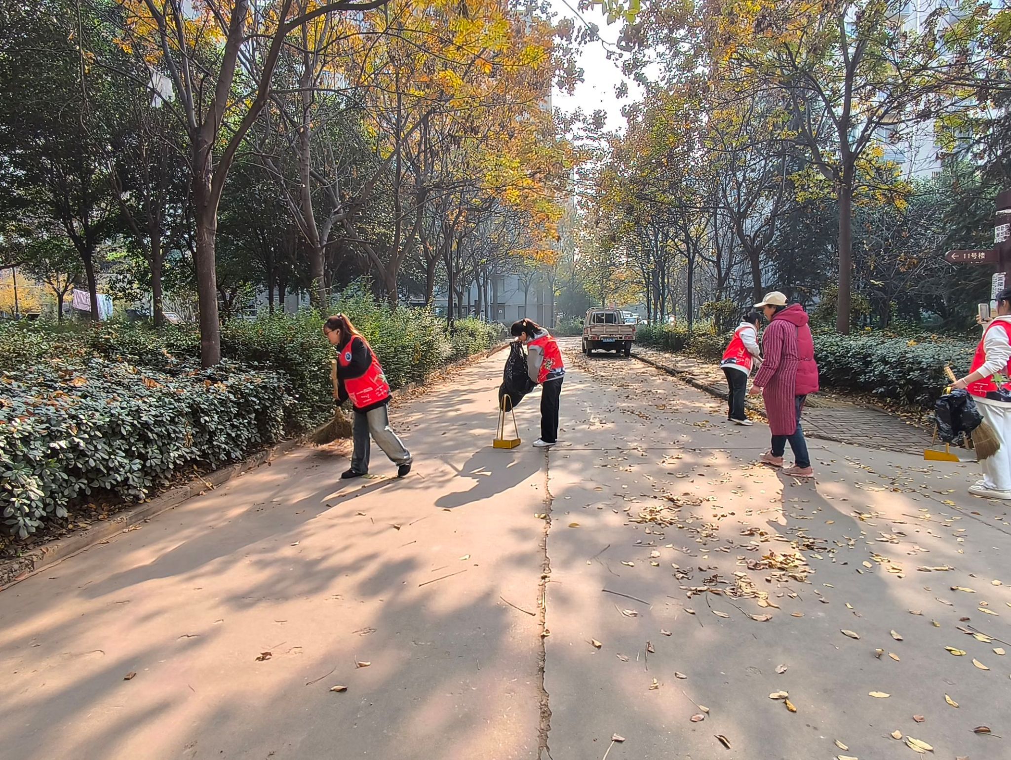 在打扫开始前,活动负责人根据区块面积将志愿者分为若干个小组,包干进行打扫,有效提高了工作效率。同学们有的利用工具在道路上清扫落叶,有的在绿化带里面捡拾碎屑,有的对警示标识进行擦拭。打扫结束后,同学们将垃圾投放到分类垃圾桶,并将打扫工具有序地放回原位。虽然当天天气寒冷,但同学们干的热火朝天,看到清理后整洁的小区环境,居民们纷纷为同学们点赞。