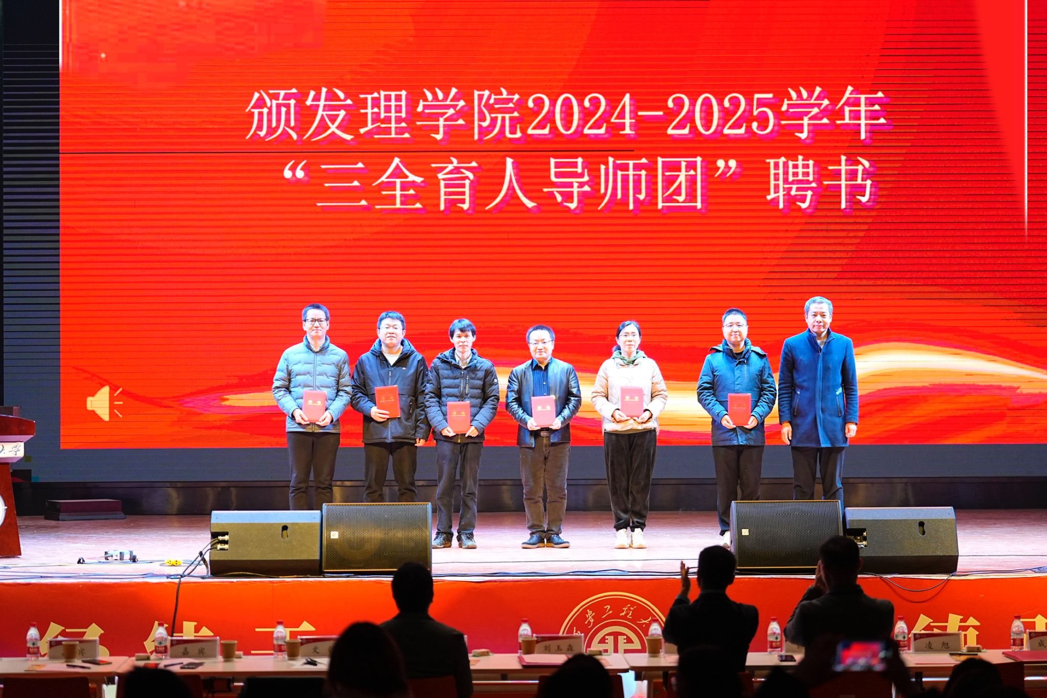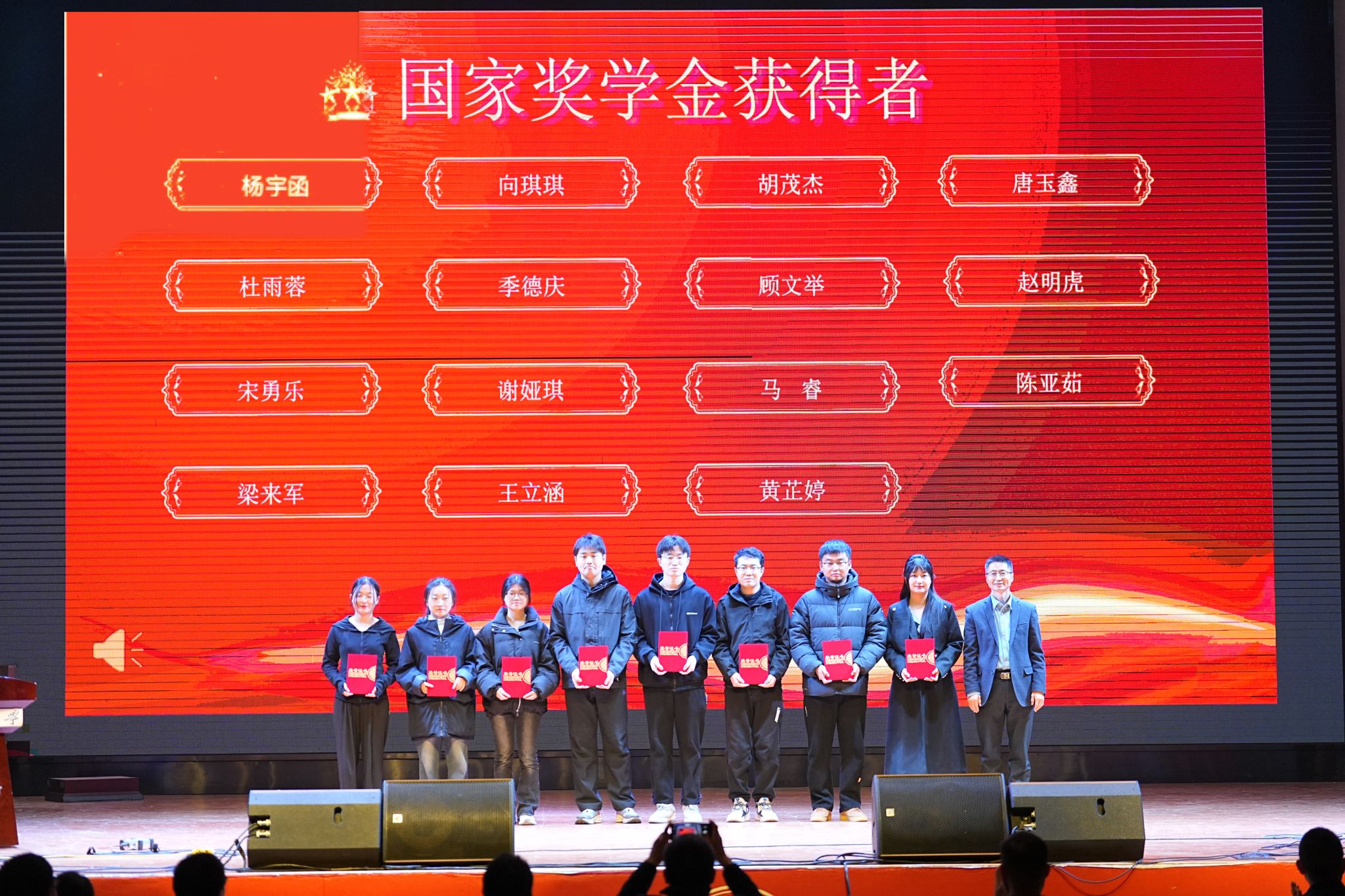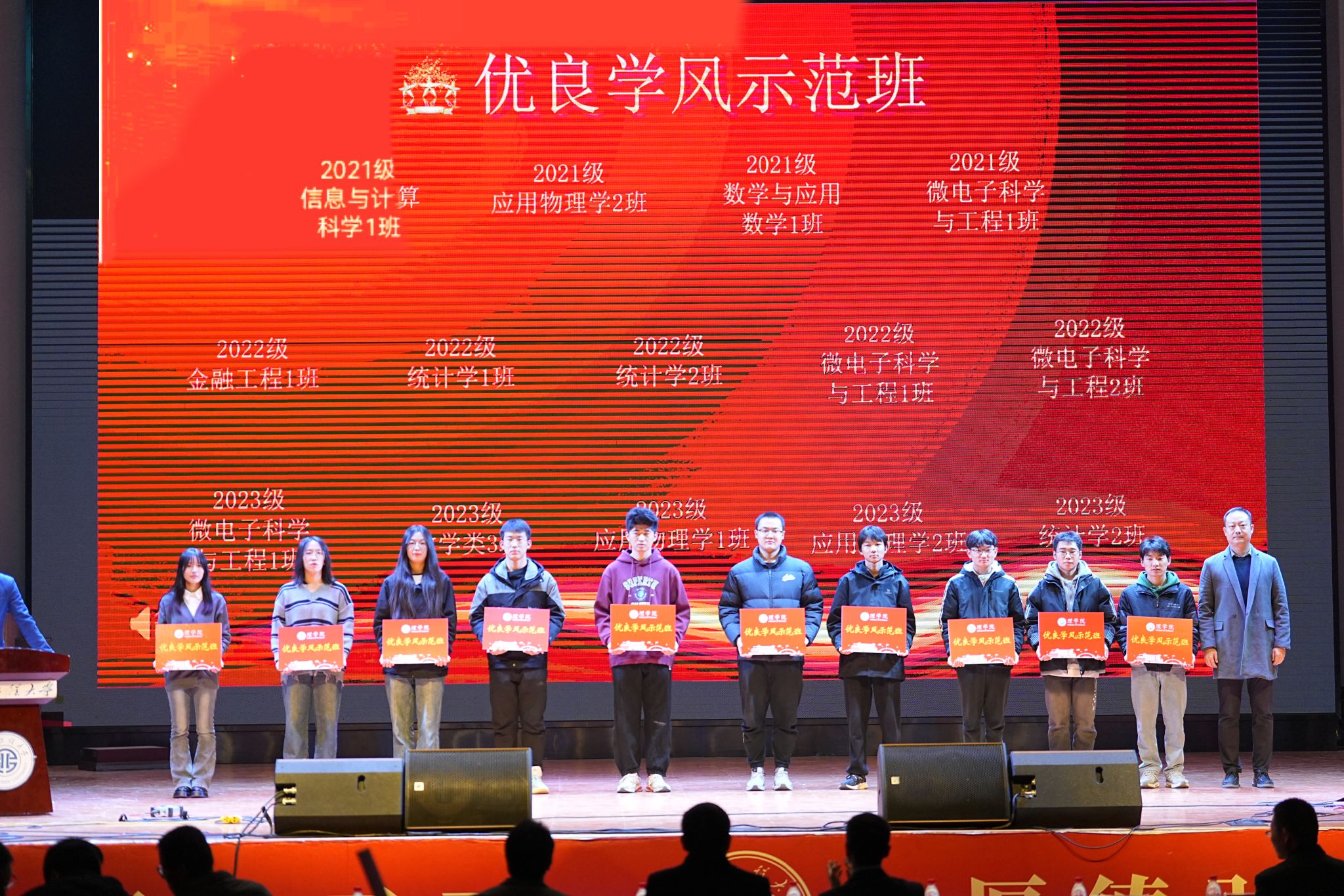 表彰会上,院党委副书记刘玉森发表致辞,他指出学院历来高度重视“三全育人”实践,2024年学院创新实践工作取得了的突出成就,他向全体获奖学生表示热烈祝贺,向长期默默奉献的老师们表示了诚挚感谢。颁奖环节,与会嘉宾和教师代表分别为获得国家奖学金、第十四届“挑战杯”中国大学生创业计划竞赛国家级银奖、2024年高教社杯全国大学生数学建模竞赛一等奖、2024年全国大学生物理实验竞赛国家级一等奖、“华为杯”第二十一届研究生建模竞赛三等奖、“正大杯”第十四届全国大学生市场调查与分析大赛总决赛三等奖、2024年(第十届)全国大学生统计建模大赛三等奖、第十二届全国大学生光电设计竞赛二等奖、2024中国机器人大赛暨RoboCup机器人世界杯中国赛国家级二等奖、第十一届中国研究生能源装备创新设计大赛三等奖、“华为杯”第六届中国研究生人工智能创新大赛三等奖以及优良学风示范班、学院“学习之星”“科技之星”“竞技之星”“文艺之星”“服务之星”等获奖个人和团队代表颁发了荣誉证书。现场还为2024-2025学年学院“三全育人导师团”负责人颁发了聘书。副院长成鹏飞进行了表彰总结,他对获奖师生表示祝贺,寄语同学们:一是要夯实知识基础;二是要提升创新能力;三是要珍惜大学时光;四是要培养坚韧品质。祝愿同学们取得新的更大成绩。