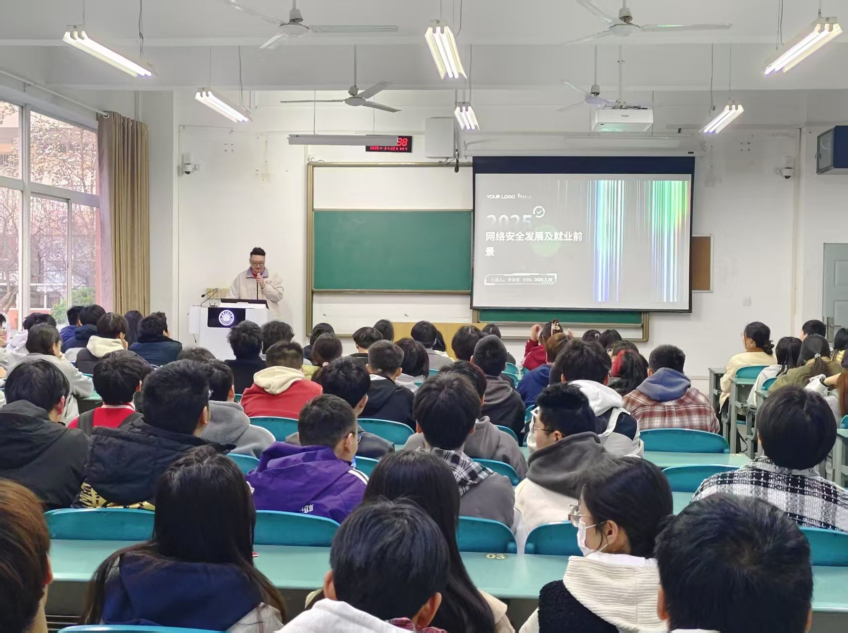 讲座现场,李金荣校友作题为《网络安全与就业发展专题讲座》,结合自己签约华为研究所的求职经验,为同学们介绍了自己从事专业网络安全的重要性、网络安全行业的发展历程、岗位供给及薪资待遇等,他特别强调了“自我认知”在就业中的重要性,提醒同学们实习经历对于毕业生的就业竞争力具有重要影响,建议同学们在学习期间积极参加实习,积累实践经验。