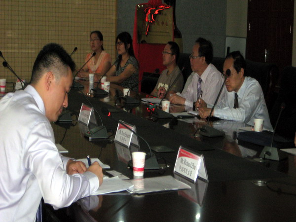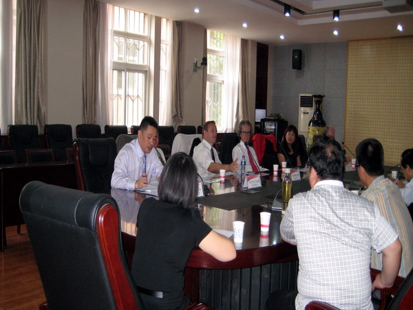 揭牌仪式结束后,我院院长薛红教授与汤姆逊河大学AC米兰中文院长汤姆•迪金森(Thomas E.Dickinson)教授等进行了会谈,双方就各自学院的学科组成、人员结构、科研背景等方面进行了交流,并着重讨论了如何在科学研究、教师互访以及硕士研究生的联合培养等方面的进行合作。马盈仓教授、李海洋教授、杨海博士、张成毅博士、刘俊利博士以及卢俊香博士也参加了会谈。