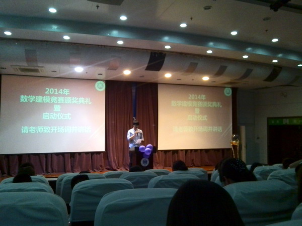 首先,主持人介绍本次仪式,然后由段鹏老师致开场词并讲话,随后主持人介绍数学建模的知识与方法,让同学对数学建模有了又一层次的了解。然后进行颁奖典礼,随后请获奖同学发表了获奖感言。最后由段鹏老师和三个学生代表一起启动了2014年数学建模竞赛。通过大家的努力,本次仪式圆满完成。