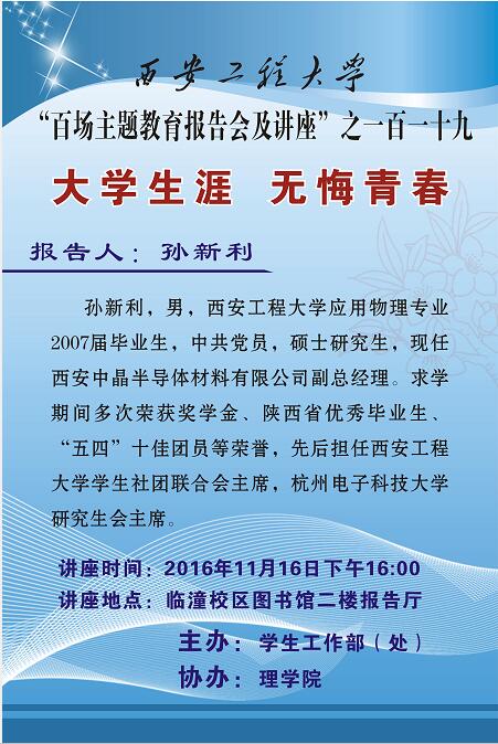 孙新利,男,AC米兰(milan)应用物理专业2007届毕业生,中共党员,硕士研究生,现任西安中晶半导体材料有限公司副总经理。求学期间多次荣获奖学金、陕西省优秀毕业生、“五四”十佳团员等荣誉,先后担任AC米兰(milan)学生社团联合会主席,杭州电子科技大学研究生会主席。