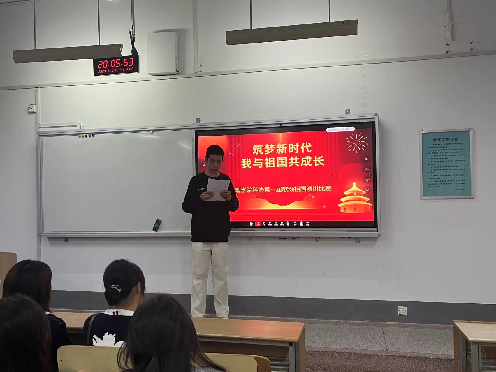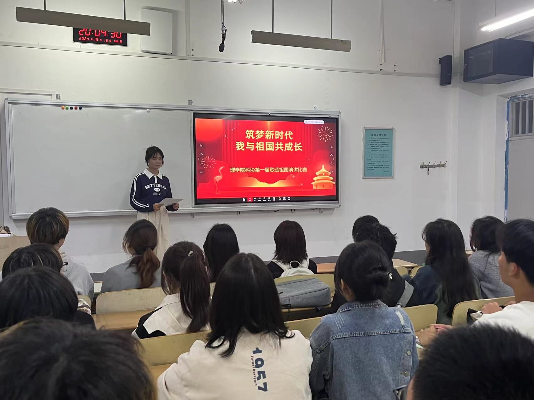 为进一步激发同学们的爱国情感,给同学们搭建一个自我展示、能力锤炼的平台,提升他们语言表达技巧和知识积累。经前期筹备,学院于10月13日成功举办了“筑梦新时代,我与祖国共成长”第一届歌颂祖国演讲比赛。