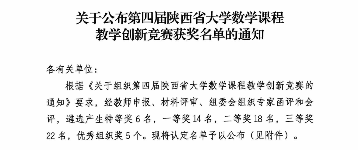 近日,第四届陕西省大学数学课程教学创新竞赛获奖结果揭晓,我校AC米兰中文3名教师获奖,其中孙娜老师获二等奖,马明菊、曹慧平分别获三等奖。