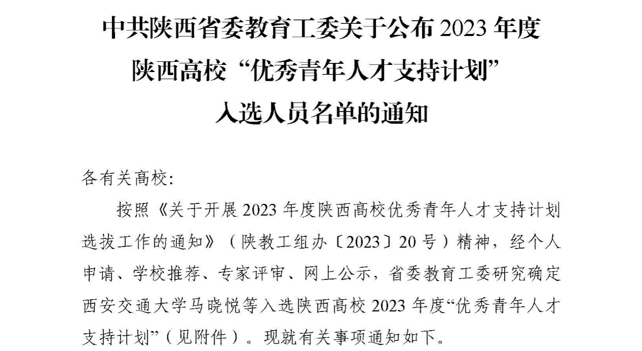近日,陕西省委教育工委下发《中共陕西省委教育工委关于公布2023 年度陕西高校“优秀青年人才支持计划”入选人员名单的通知》(陕教工函〔2024〕175 号),我院教师韩小祥入选。陕西高校“优秀青年人才支持计划”的评选旨在进一步加强我省高校高层次人才队伍建设,加快提升高端人才储备,着力培养、造就一批青年学术骨干,构筑良好的人才发展梯队。“青年杰出人才支持计划”着眼于人才基础性培养和战略性开发,提升我省高教系统人才竞争力,采取定期选拔、年度考核、动态调整的模式,选拔和支持一批研发水平高、创新能力强、综合素质好、发展潜力大的优秀青年学术技术人才,为我省实现追赶超越提供强有力的人才支撑和智力支持。(撰稿:韩小祥 审核:刘玉森)