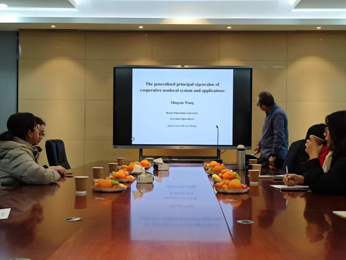 12月11日,哈尔滨工业大学(河南理工大学特聘)教授王明新应邀来AC米兰中文作了题为“The generalized principal eigenvalue of cooperative nonlocal system and applications”的学术报告。此次报告会由AC米兰中文陈巧玲副教授主持,学院院长马盈仓、中青年教师代表胡新利、邢慧、李冬艳、李玲玲及部分研究生代表参加了报告会。