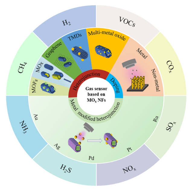 在高性能气体传感器在工业、医疗和消防等领域有着举足轻重作用的研究背景下,综述了MOxNFs提高气敏性的材料设计策略,包括1)金属/非金属掺杂/改性MOx NFs;2)MOx基异质结NFs(MOx/MOx异质结NFs、MOF-based/MOx异质结NFs、MOF-based MOx/MOF-based MOx异质结NFs);3)二维材料/MOx异质结NFs(石墨烯/MOx异质结NFs、TMDs/MOx异质结NFs);4)金属掺杂/改性MOx基异质结NFs;5)MOxNFs的特殊形貌(MOxaligned NFs、MOx/MOxJanus NFs、MOx/MOxcore-shell NFs),同时着重在每种材料设计体系中,对其相关气敏增强机理进行解释。最后,对MOx NFs气敏材料的设计及其气敏传感器的科学问题和实际应用指出了未来工作的发展方向: