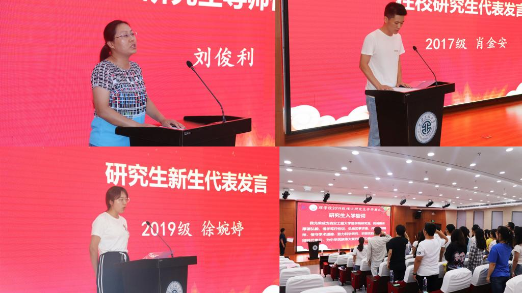 典礼在庄严的国歌声中拉开帷幕。学院研究生导师代表、香港桑麻奖教金获得者、陕西省高等学校科学技术二等奖获得者刘俊利教授,学院在校研究生代表、院研究生会主席、2017级概率论与数理统计专业研究生肖金安,学院新生代表、2019级微纳电子物理专业研究生徐婉婷依次在典礼上做了发言。