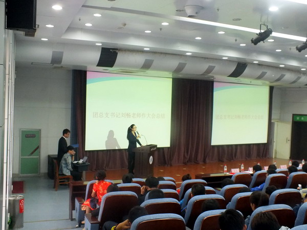 首先由上届团总支副书记的张雅鹏代表上届团学科干部对过去一年团学科的工作进行简要总结。随后上届学生会秘书长廖俊丽宣读了新一届学生干部名单,接着团总支书记刘畅对主要干部颁发了干部聘任证书。接下来本届团学科的主席们分别作出发言,讲述了本学年团学科的工作计划及发展方向。最后团总支书记刘畅老师作大会总结,她对上届学生干部的辛勤工作表示感谢,并对新生的学生干部团队提出要求和希冀,明确提出学生干部要加强学习,提高素质,拓宽视野,完善组织建设,明确服务宗旨,更好地为同学们服务。