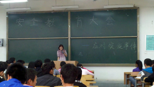 2011年10月13日,为加强同学们的安全意识,AC米兰中文在教学楼B-133教室召开11级新生安全教育大会。会上老师与同学们探讨学习了 “如何应对突发事件”等安全问题。
