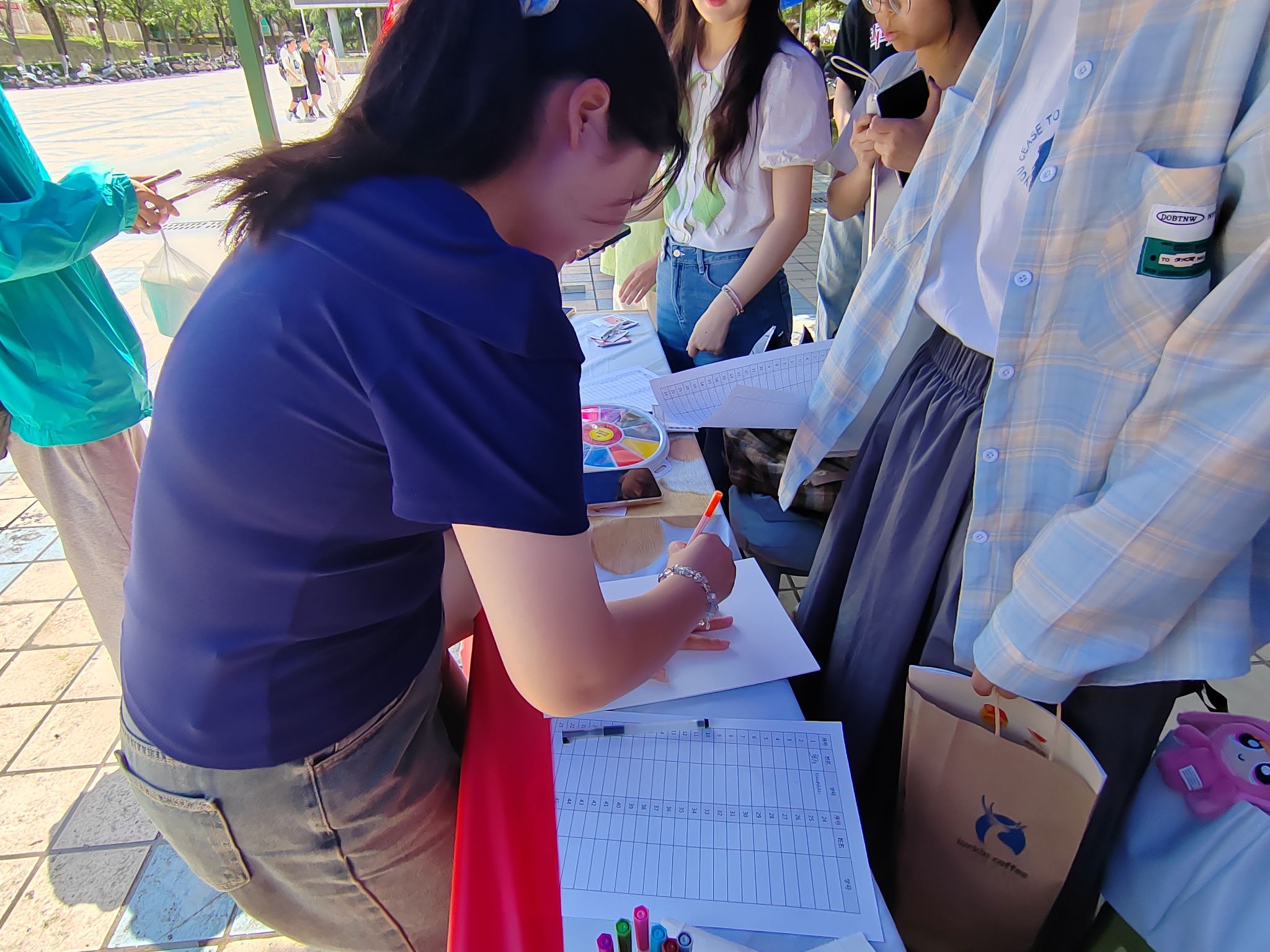 活动设置“创意展板互动区”“请和我击掌吧”“正话反说游戏区”三大板块。展板互动区聚焦“勇气大爆发”“爱自己的100种方式”“指纹DIY”趣味内容,鼓励学生直面内心渴望、探索自我、接纳关怀。在“请和我击掌吧”区域,同学们以手绘掌印和书写寄语传递温暖,参与者可随机摘取他人留言,收获匿名鼓励。游戏区则通过“正话反说”挑战,锻炼思维灵活性,缓解学业压力,现场笑声不断。活动中,老师们还与毕业生们交流就业和毕业设计等,鼓励毕业生们抓紧毕业设计、认真准备求职,调整心态积极面对即将到来的职场生活。