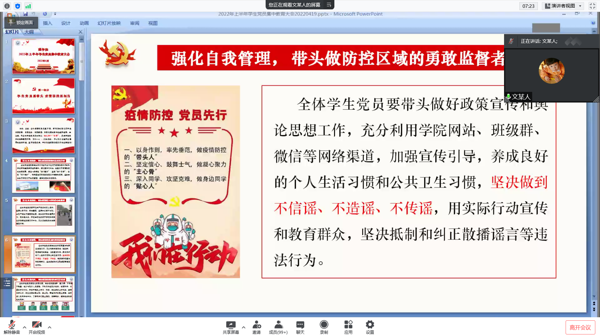 会上,院党委委员、学工办主任文毅以党课的形式对全体学生党员进行了集中教育。针对目前新冠疫情散发多发和学校执行相关管控规定的实际情况,他以“学生党员勇带头、疫情防控显担当”为题向同学们发出倡议:一是强化自我教育,科学理性对待各项防控工作举措和政策,坚决带头执行校院两级精准防控的各项要求;二是强化自我服务,坚持以身作则、率先垂范,积极主动投身各项工作,充分发挥党员的先锋模范作用;三是强化自我管理,带头做好各项政策宣传,坚决做到不信谣、不造谣、不传谣,坚决抵制和纠正散播谣言等行为;四是强化自我约束,制定科学、合理的学习计划,积极开展线上或线下学习、科研,树立正确的就业观、择业观,营造良好的学习生活氛围。接下来,他以“喜迎二十大、奋进新征程”为题带领全体党员回顾了2021年党和国家取得了一系列伟大成绩,对党的十九届六中全会精神再次进行了领学,希望同学们努力锤炼自身、不断提升综合素质,在学习生活中不断完善,用实际行动迎接党的二十大胜利召开。