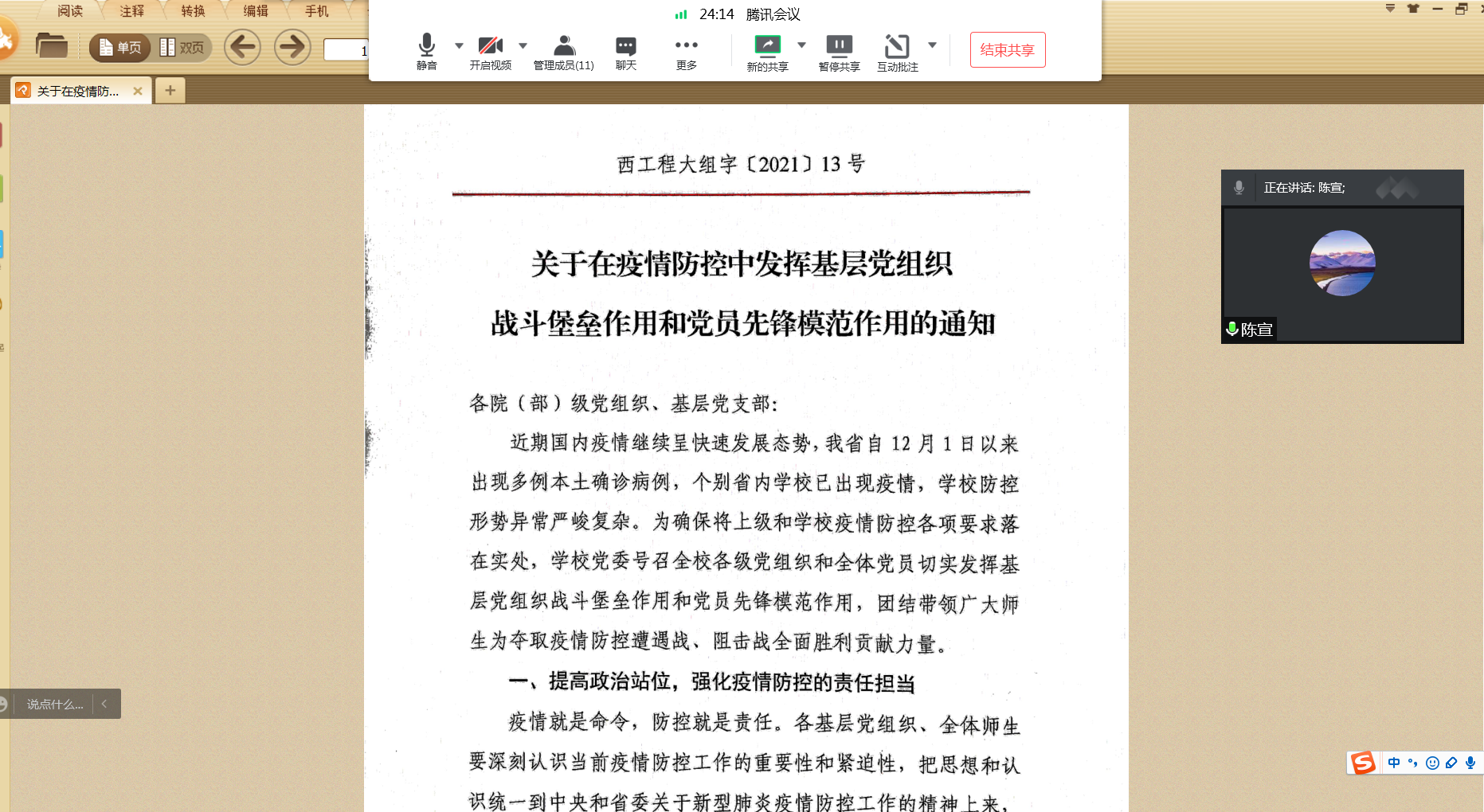 陈宣还根据近期学校工作安排,结合学校下发的《关于在疫情防控中发挥基层党组织战斗堡垒作用和党员先锋模范作用的通知》要求,对学院近期疫情防控等工作进行了安排部署。