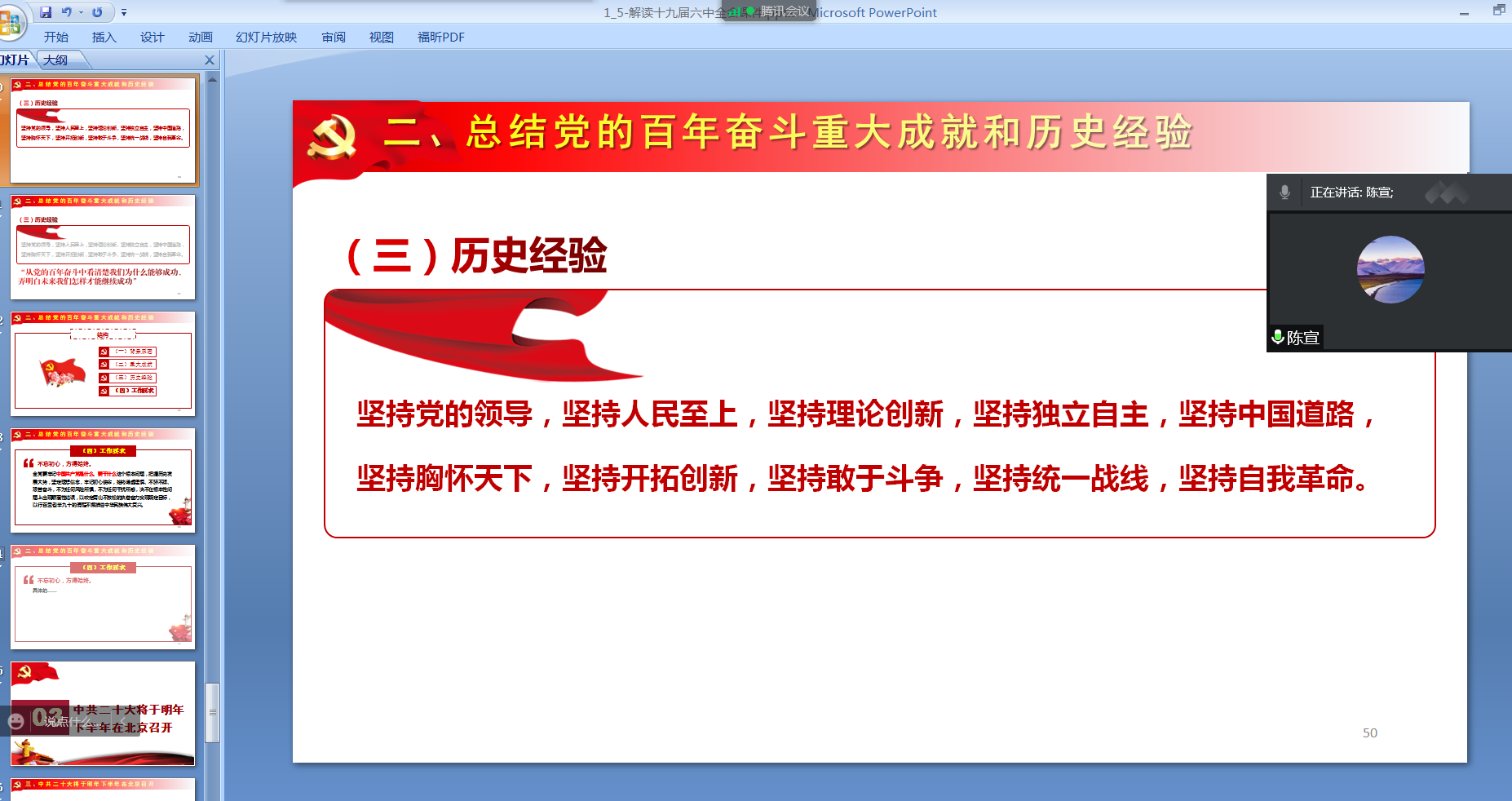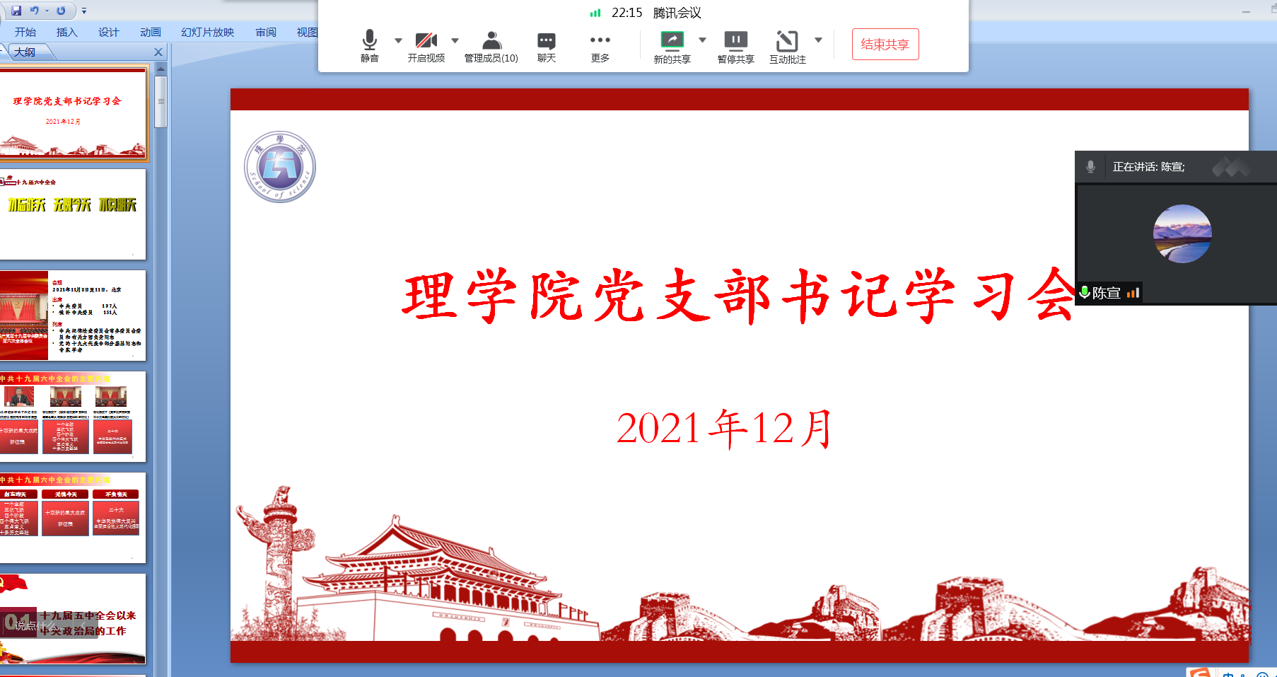 会上,陈宣利用PPT领学了党的十九届六中全会精神,结合自身学习体会指出:党的十九届六中全会的召开镌刻了历史成绩,启迪了未来发展,吹响了全面建设社会主义现代化国家的冲锋号,是引领实现中华民族伟大复兴的里程碑。党确立习近平同志党中央的核心、全党的核心地位,确立习近平新时代中国特色社会主义思想的指导地位,反映了全党全军全国各族人民共同心愿。全院师生党员要自觉担负起学习宣传贯彻习近平新时代中国特色社会主义思想和党的十九届六中全会精神的政治责任,在前一阶段学习的基础上,进一步学懂弄通做实,团结师生员工将全会精神落实到立德树人的教育实践中,始终牢记初心使命,矢志不渝奋斗前行。各党支部书记就学习全会精神进行了交流。