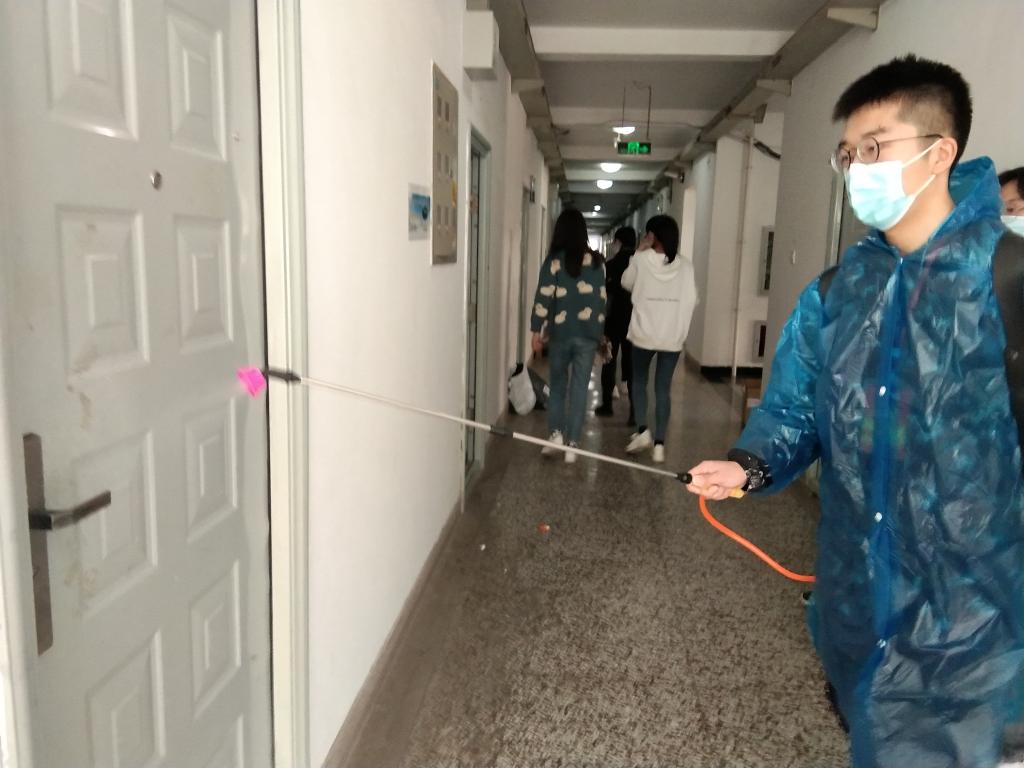 消杀前,学院准备了一次性雨衣、电动喷雾器、84泡腾片、一次性口罩等物资,并对参与人员进行了集中培训和分组,要求参与人员佩戴标牌,履行登记手续,严格配比消毒液,认真对宿舍地面、门把手进行消杀。消杀时,参与人员按照分工,分别到1号、3号、4号、5号、7号、8号、9号学生公寓开展工作,开门、消杀、锁门等环节配合紧密,确保消杀到位,不留死角。工作中,同学们不计劳累,背负20多斤重的电动喷雾器时争先恐后;负责开门的党员在开门时都会认真确认宿舍是否有人,再进行开门;负责锁门的党员锁完门后都会用力推下门,确认门锁好。参与人员细致热心的工作得到了同学们的一致赞扬。