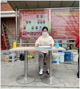 疫情面前,一座城市的作为决定着每个人的安危;疫情面前,每个人的防护又将铸就城市抗击疫情的铜墙铁壁。“艰辛知人生,实践长才干”,在这个非常时期,社区人流动性开始加大,同时志愿者紧缺,作为新时代大学生,应当走在防疫前列,积极投身防控前线,配合小区物业做好排查,定点执勤工作,同时也让她知道了基层工作的艰辛和不易。她说:“这一次的志愿者活动让我感触很多,也让我从中学到了很多书本上学不到的东西,同时我也理解了‘从群众中来,到群众中去’的真正涵义。认识到只有把个人的命运同社会、同国家的命运联系起来,才是青年成长成才的正确之路。”