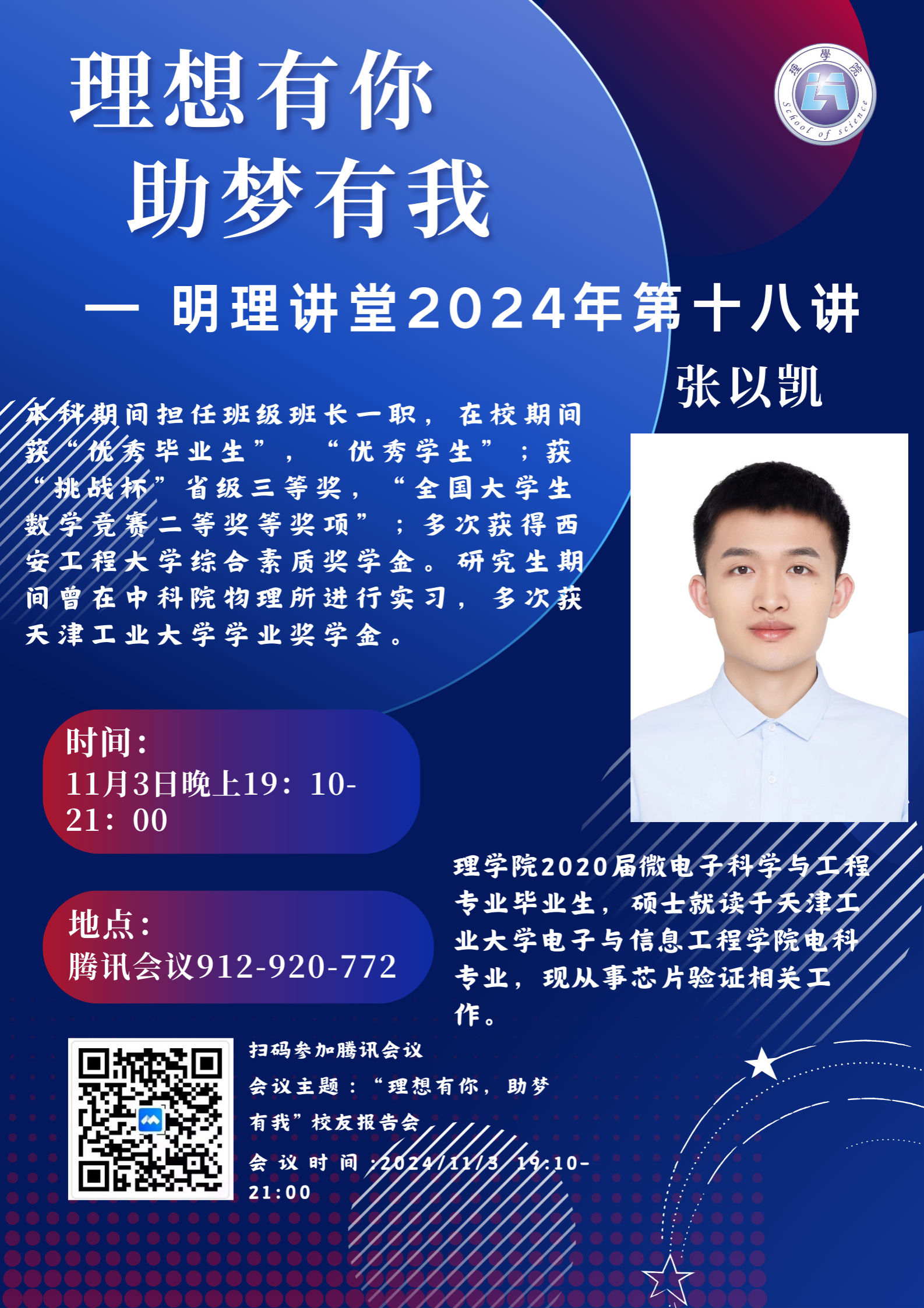 张以凯,AC米兰中文2020届微电子科学与工程专业毕业生,硕士毕业于天津工业大学电子与信息工程学院电科专业。本科期间,担任班级班长,获“优秀毕业生”“优秀学生”等荣誉称号,荣获“全国大学生数学竞赛二等奖”“挑战杯省级三等奖”等竞赛奖项,在校期间多次获得校综合素质奖学金。研究生期间曾在中国科学院物理所进行实习,多次获天津工业大学学业奖学金。现从事芯片验证相关工作。