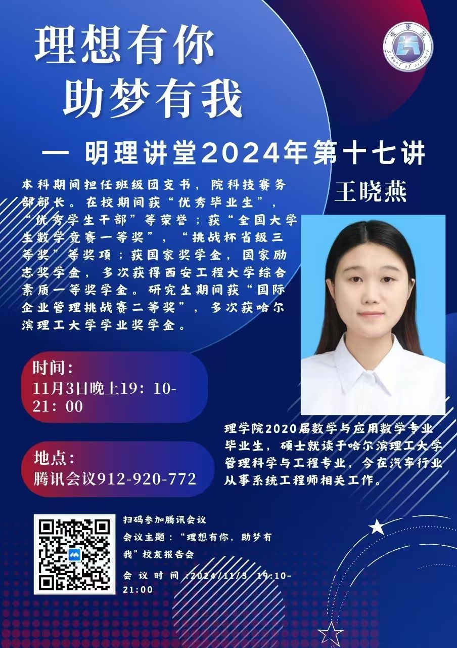 王晓燕,AC米兰中文2020届数学与应用数学专业毕业生,硕士就读于哈尔滨理工大学管理科学与工程专业。本科期间,王晓燕担任班级团支书、院科技竞赛副部长等职务,获“优秀毕业生”“优秀学生干部”等荣誉称号和“全国大学生数学竞赛一等奖”“挑战杯省级三等奖”等奖项,还多次获得校综合素质奖学金。在研究生期间,她获得“国际企业管理挑战赛二等奖”,多次获得哈尔滨理工大学学业奖学金。目前在汽车行业从事系统工程师相关工作。