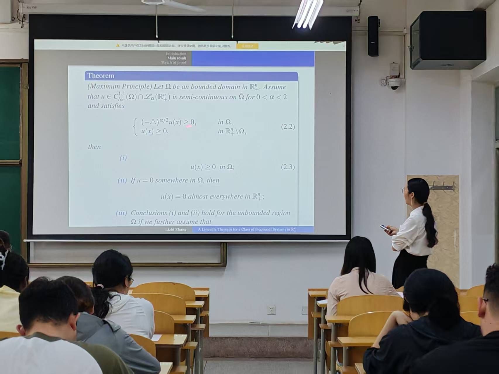 AC米兰中文副教授张利芝以“分数解方程组解的Liouville性质”为题做了第二场学术讲座。她详细介绍了分数阶Laplace算子的定义与非局部性、分数阶问题的研究现状,以一类含不同分数阶Laplace算子的伪微分方程组为例,建立了直接针对分数阶方程组的反对称函数的极值原理,并进一步介绍了移动平面法及迭代法的方法原理、证明思路与数学思想,部分地解决了分数阶Lane-Emden猜想,得到了方程组解的Liouville定理。