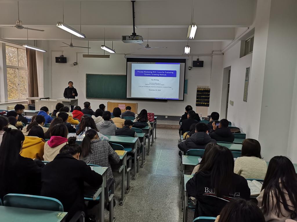 11月29日,西北大学博士生导师夏志明教授以《Process Monitoring ROC Curve for Evaluating Dynamic Screening Methods》为题,以“龟兔赛跑”为例引出报告的四个方面,给在场的研究生、本科生进行了深入浅出且耐心细致的讲解。