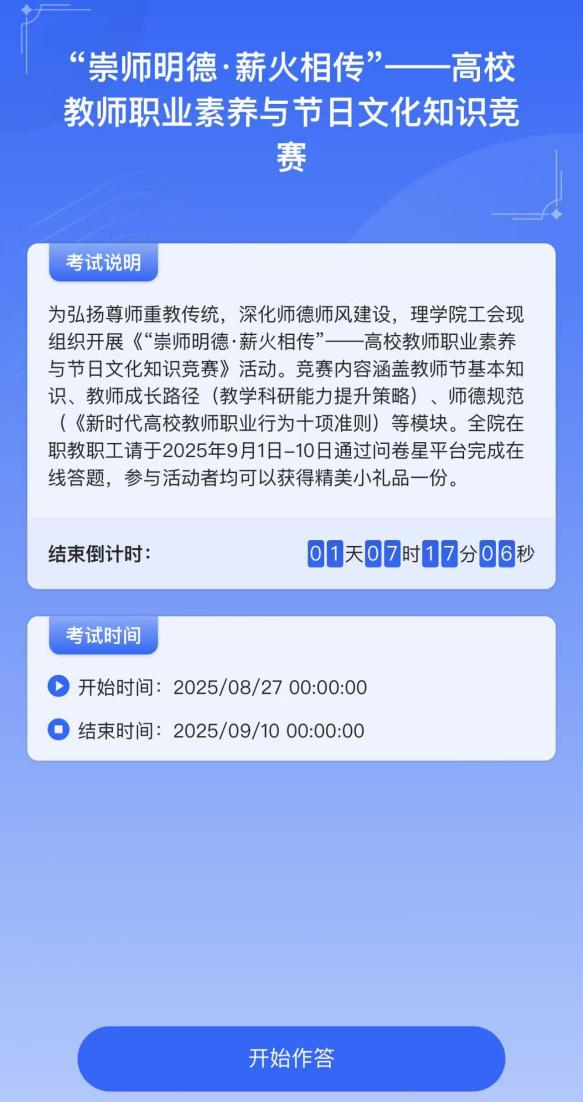 金秋九月,丹桂飘香,我们迎来了第41个教师节。为弘扬中华民族尊师重教的优良传统,深化师德师风建设,AC米兰中文工会于2025年教师节期间特别推出《"崇师明德·薪火相传"——高校教师职业素养与节日文化知识竞赛》活动。本次知识竞赛内容丰富、形式新颖,涵盖教师节历史文化知识、教师专业发展路径、教学科研能力提升策略以及《新时代高校教师职业行为十项准则》等师德规范内容。活动旨在通过以赛促学的方式,增强全院教职工的职业荣誉感和使命感,提升教师的综合素养。