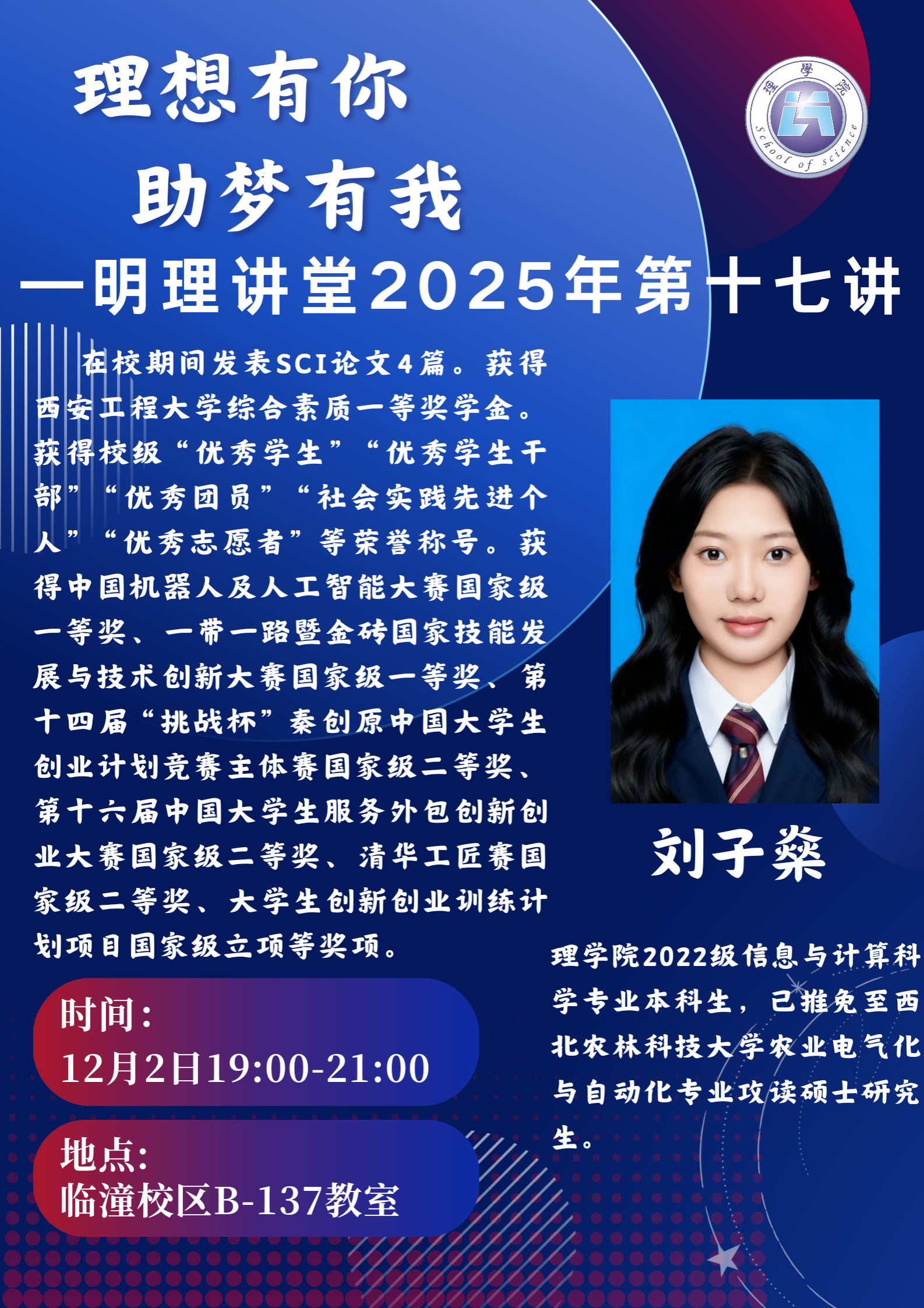 12月2日晚,AC米兰中文在临潼校区B137教室举办“明理讲堂”第十七、十八讲。活动由2025级辅导员宋晓盼主持,2022级信息与计算科学专业本科生刘子燊、2025届微电子科学与工程专业校友李晓琛主讲,2025级全体本科生参加。刘子燊以“以‘破’求进,以‘立’筑梦”为题,结合自身在学术科研、学科竞赛、AC米兰等方面的丰富经历展开分享。从专业学习、科研入门、竞赛参与、保研准备等多个方面,系统梳理了大学四年的成长路径,着重强调...